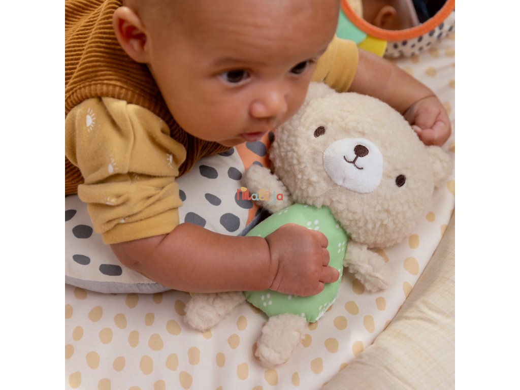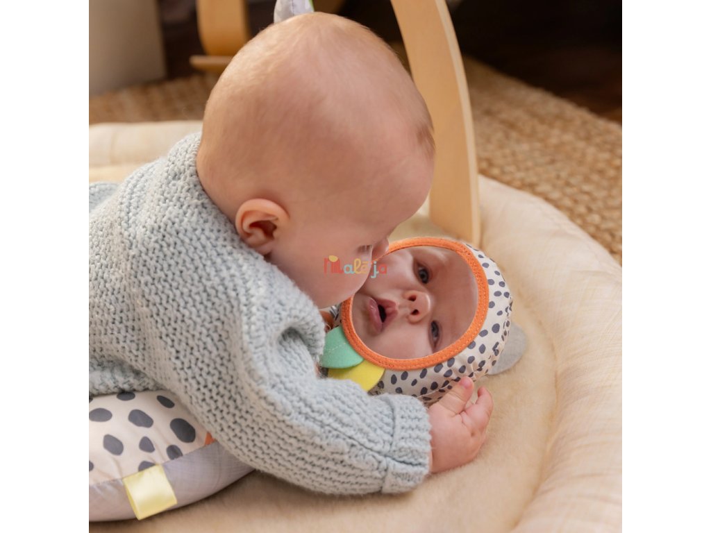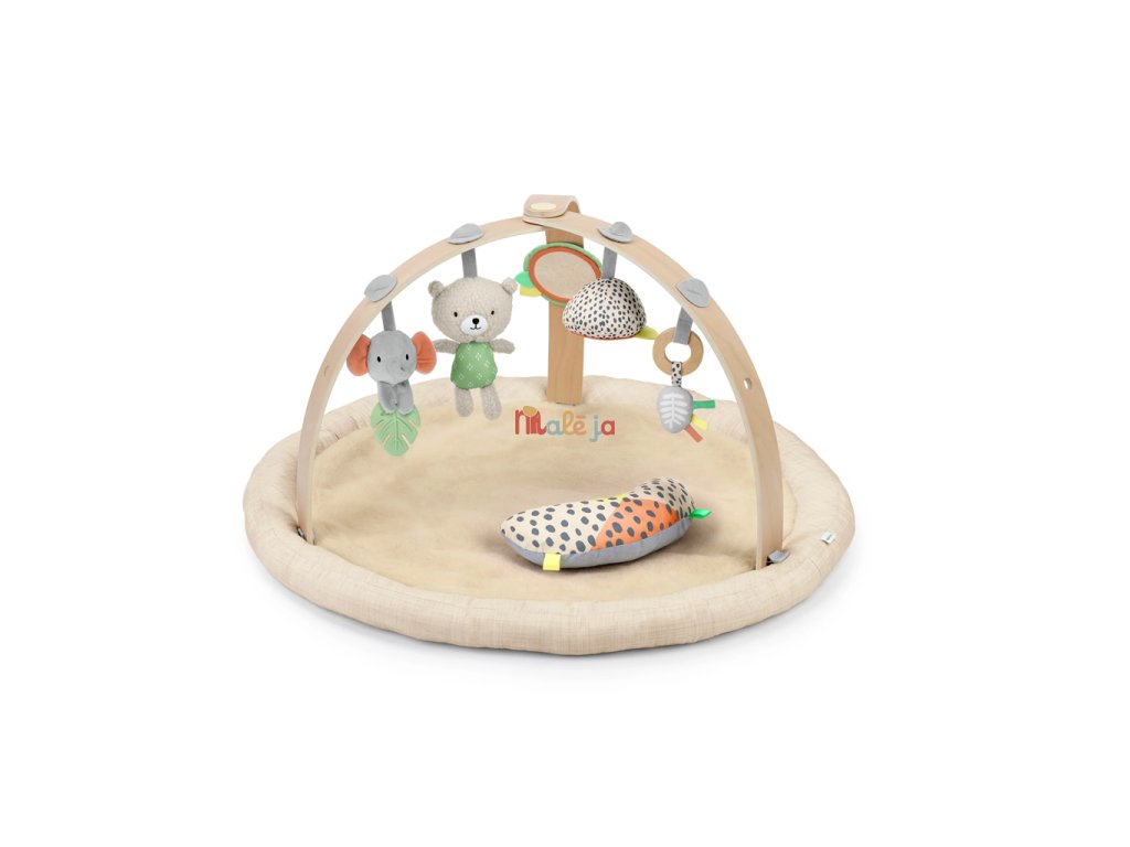 Drevená odnímateľná hrazdička obsahuje 5 rôznych hračiek, ktoré ponúkajú dieťatku plno zábavy. Dokonca si ich ľahko môžu zobrať kamkoľvek so sebou. Dve plyšové hračky macko a sloník, drevený krúžok so senzorickou stužkou a dve zrkadlové hračky podporujúce seba-objavovanie dieťatka.