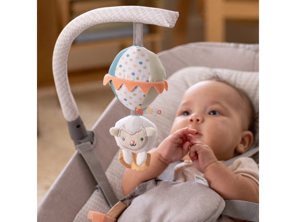 - Odnímateľná hrazdička s 2 hračkami – plyšový balón a drevený krúžok so štítkami