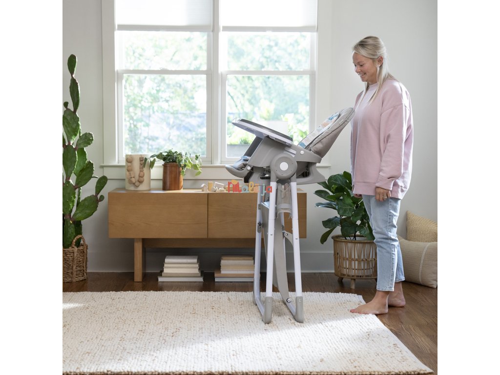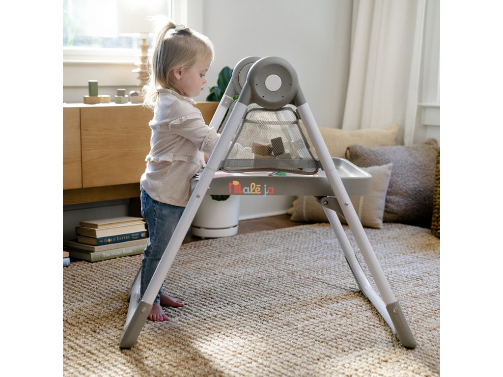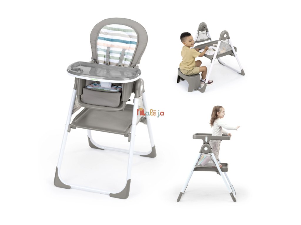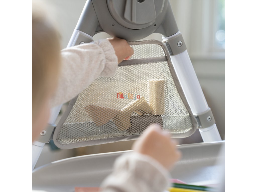 Narodilo sa vám druhé dieťa? Táto stolička dokáže poslúžiť dvom deťom naraz v 6 rôznych kombináciách v režimoch hojdacie kreslo, stolík, veža a nadstavba na stoličku. Pre najmenších zaručuje ergonomický dizajn 90-90-90 správne držanie tela – členky, kolená a bedrá v pravom uhle pre lepšie trávenie počas jedla. Päťbodový bezpečnostný pás udrží dieťa v bezpečí. Ako dieťa rastie, stále oceníte funkcie ako 3-polohový pultík s vložkou vhodnou do umývačky riadu a odkladací priestor pod sedadlom. Keď sa z dieťatka stane batoľa, obľúbené hračky a potreby na tvorenie si môže uložiť do praktických úložných vreciek na bočnej strane stolíka. Súčasťou je aj odnímateľná lavica ako ďalšia možnosť sedenia.