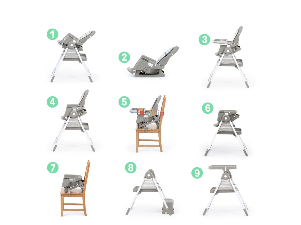 - 9 režimov pre jedno dieťa: plne sklopné kresielko, odnímateľné hojdacie kreslo, vysoká stolička, stolička k stolu, prenosná stolička na bežnú stoličku, stolička pre batoľa, podsedák, učiaca/kuchynská veža, kreatívny stolík so stoličkou