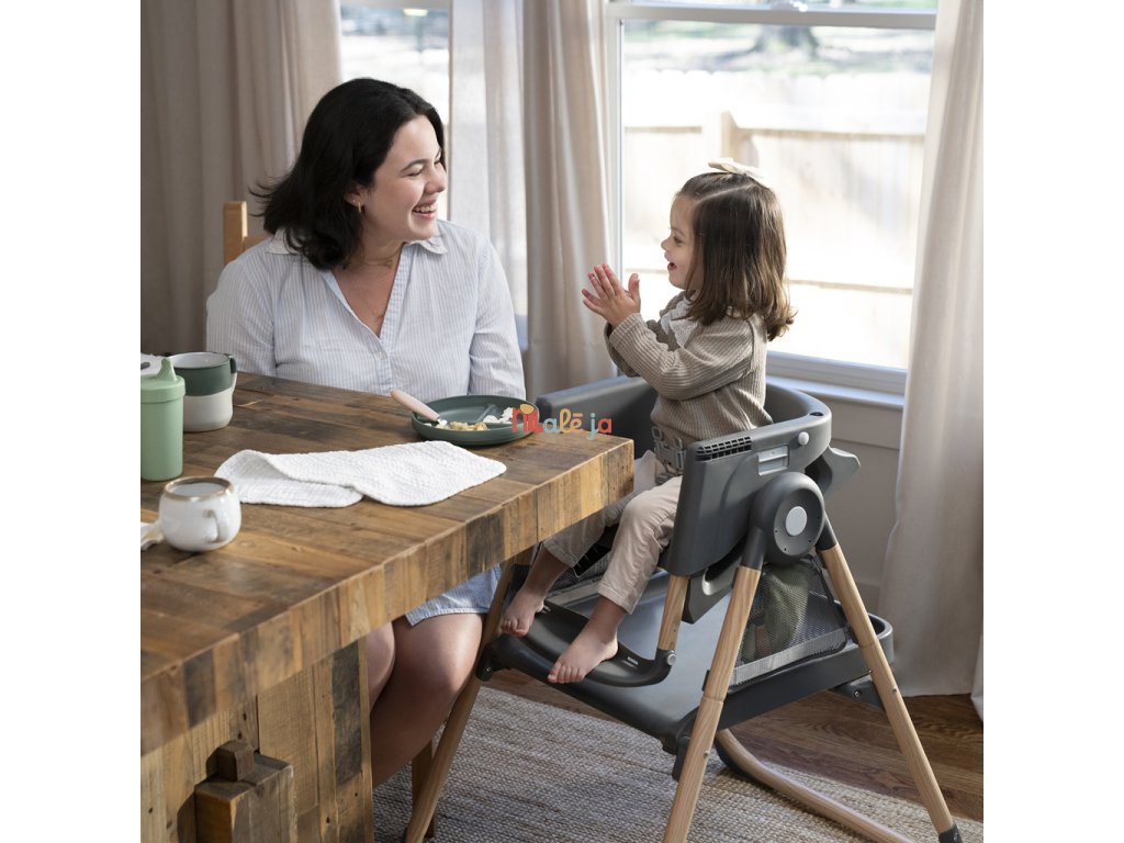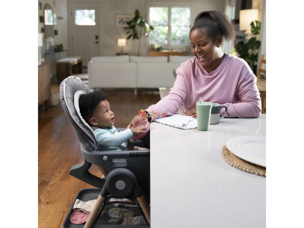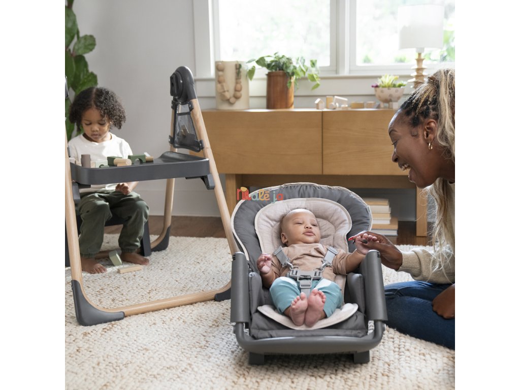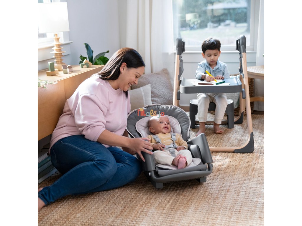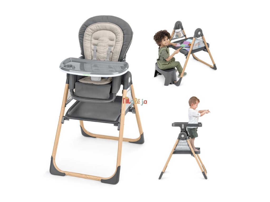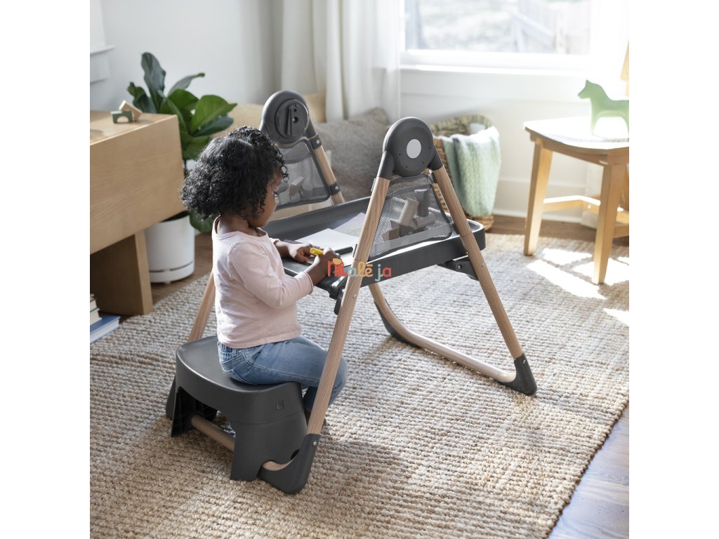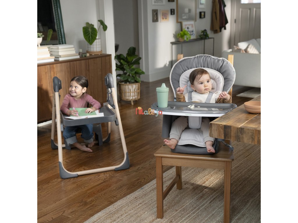 Narodilo sa vám druhé dieťa? Táto stolička dokáže poslúžiť dvom deťom naraz v 6 rôznych kombináciách v režimoch hojdacie kreslo, stolík, veža a nadstavba na stoličku. Pre najmenších zaručuje ergonomický dizajn 90-90-90 správne držanie tela – členky, kolená a bedrá v pravom uhle pre lepšie trávenie počas jedla. Päťbodový bezpečnostný pás udrží dieťa v bezpečí. Ako dieťa rastie, stále oceníte funkcie ako 3-polohový pultík s vložkou vhodnou do umývačky riadu a odkladací priestor pod sedadlom. Keď sa z dieťatka stane batoľa, obľúbené hračky a potreby na tvorenie si môže uložiť do praktických úložných vreciek na bočnej strane stolíka. Súčasťou je aj odnímateľná lavica ako ďalšia možnosť sedenia.