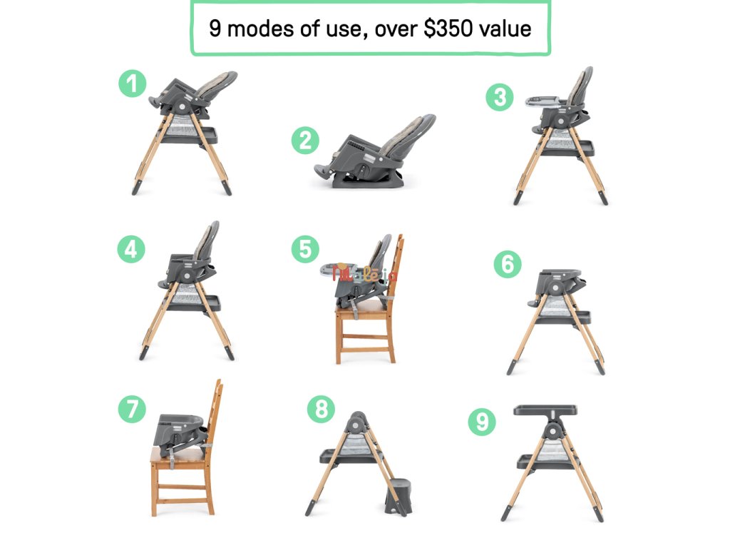 - 9 režimov pre jedno dieťa: plne sklopné kresielko, odnímateľné hojdacie kreslo, vysoká stolička, stolička k stolu, prenosná stolička na bežnú stoličku, stolička pre batoľa, podsedák, učiaca/kuchynská veža, kreatívny stolík so stoličkou