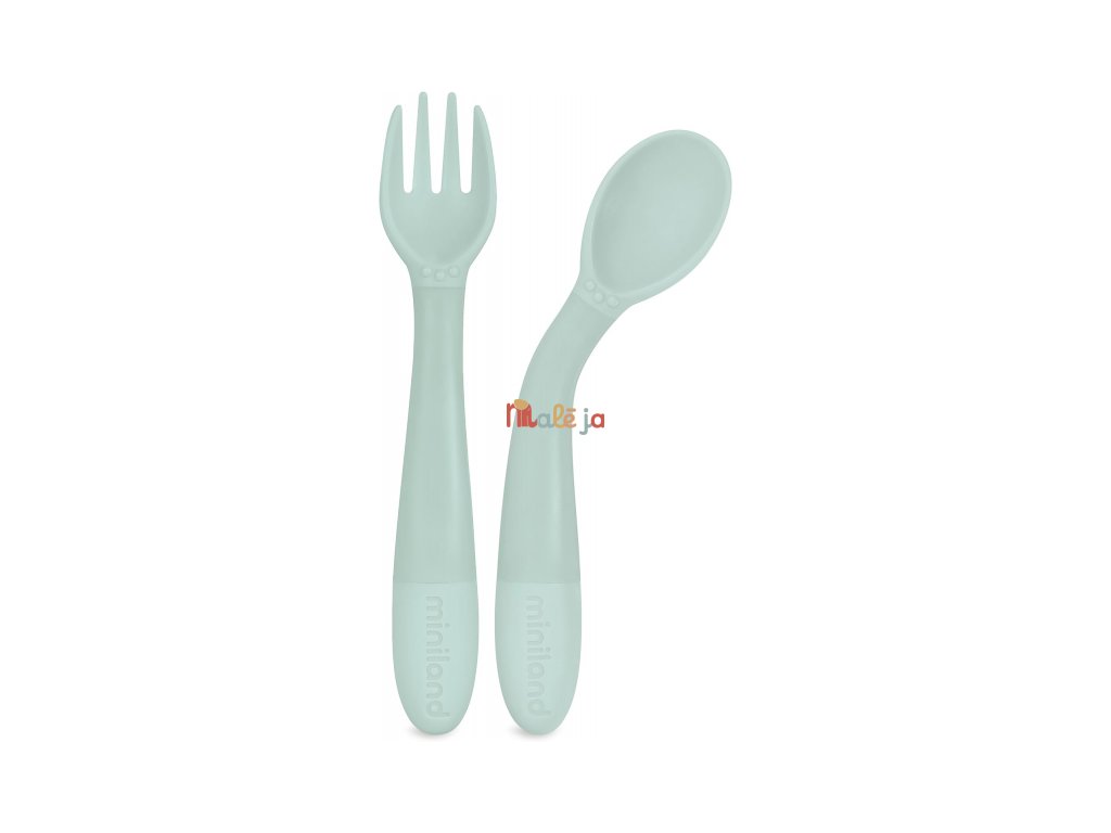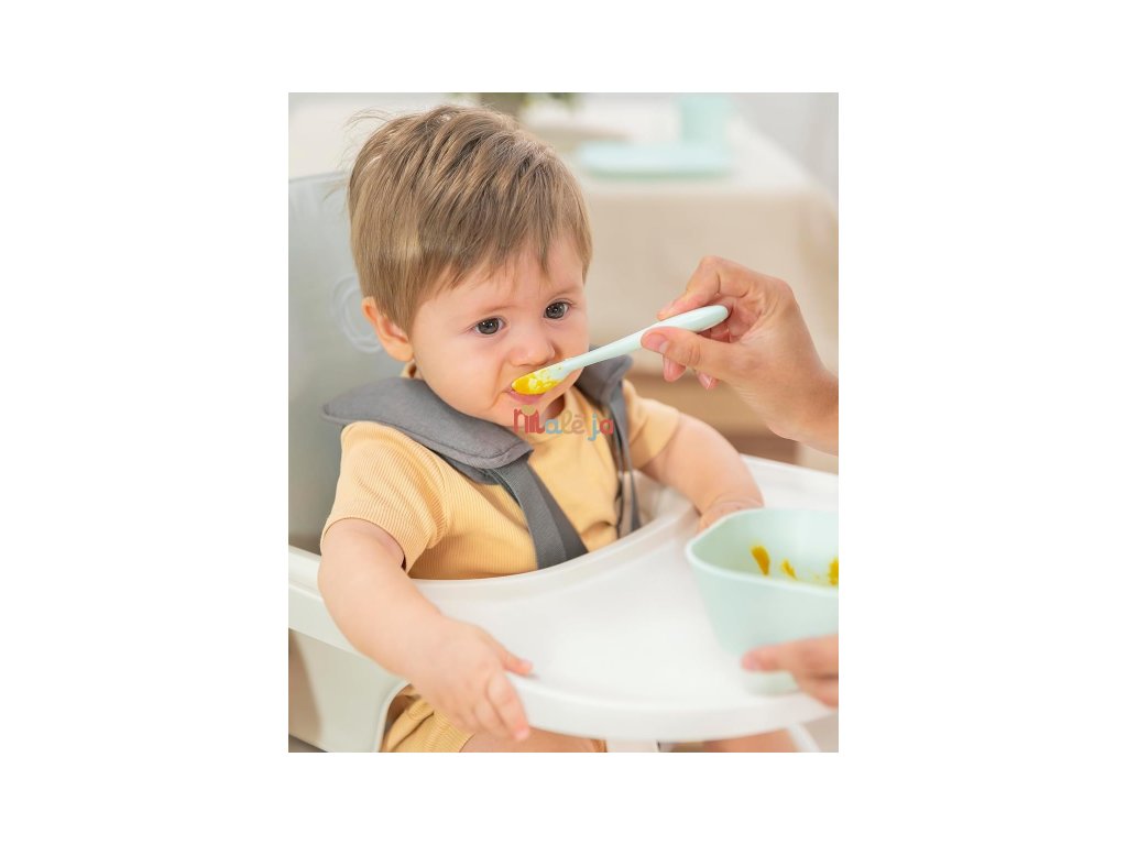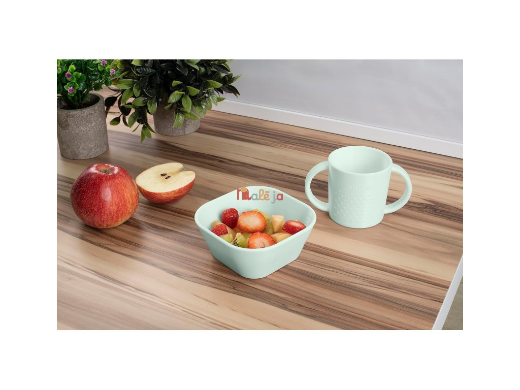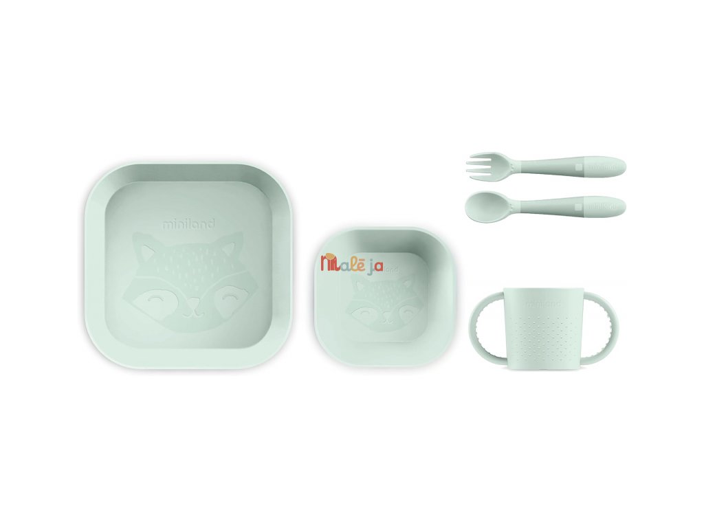 Jedálenskú sadu tvorí tanier, miska, hrnček s 2 úchytmi, pružná lyžička a vidlička. Tanier aj miska s vysokými okrajmi pomáhajú ľahkému naberaniu pokrmu. Lyžička a vidlička sú vyrobené z flexibilného príjemného materiálu a majú nekĺzavé, okrúhle držadlá, ktoré uľahčujú dieťaťu držanie. Hrnček s dvoma ušami pomáha dieťaťu naučiť sa piť z klasického hrnčeka.