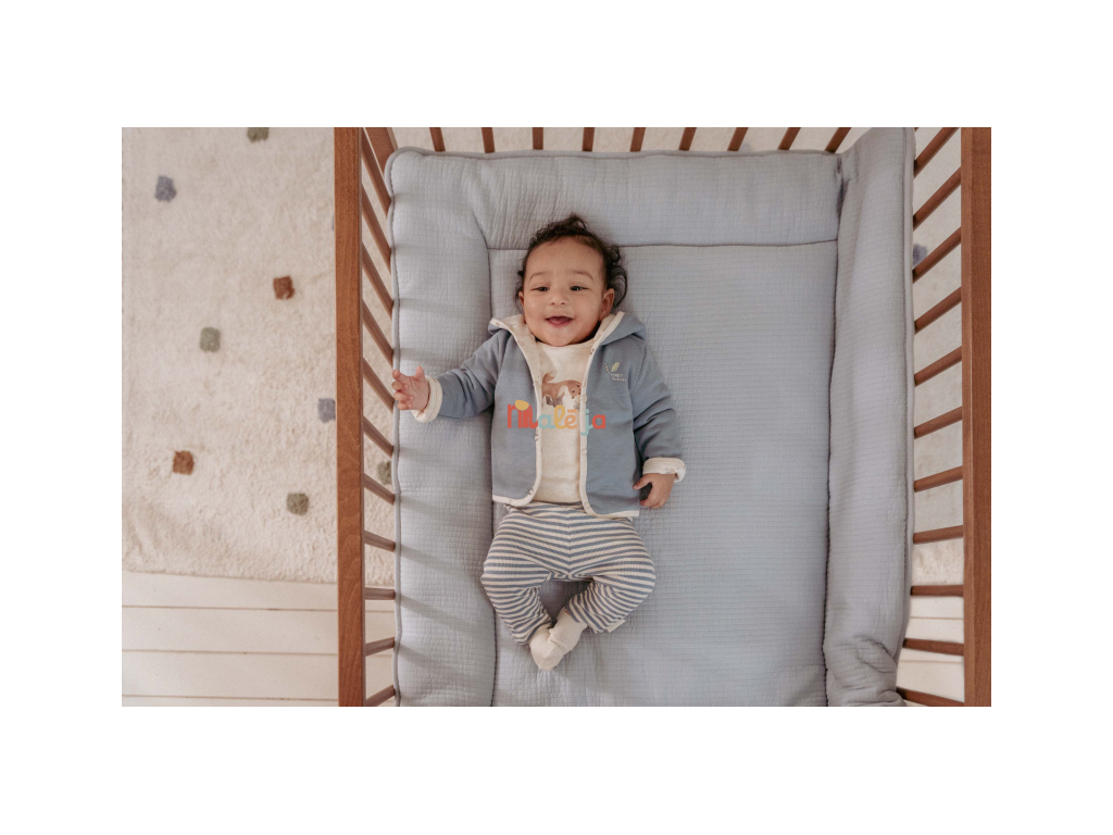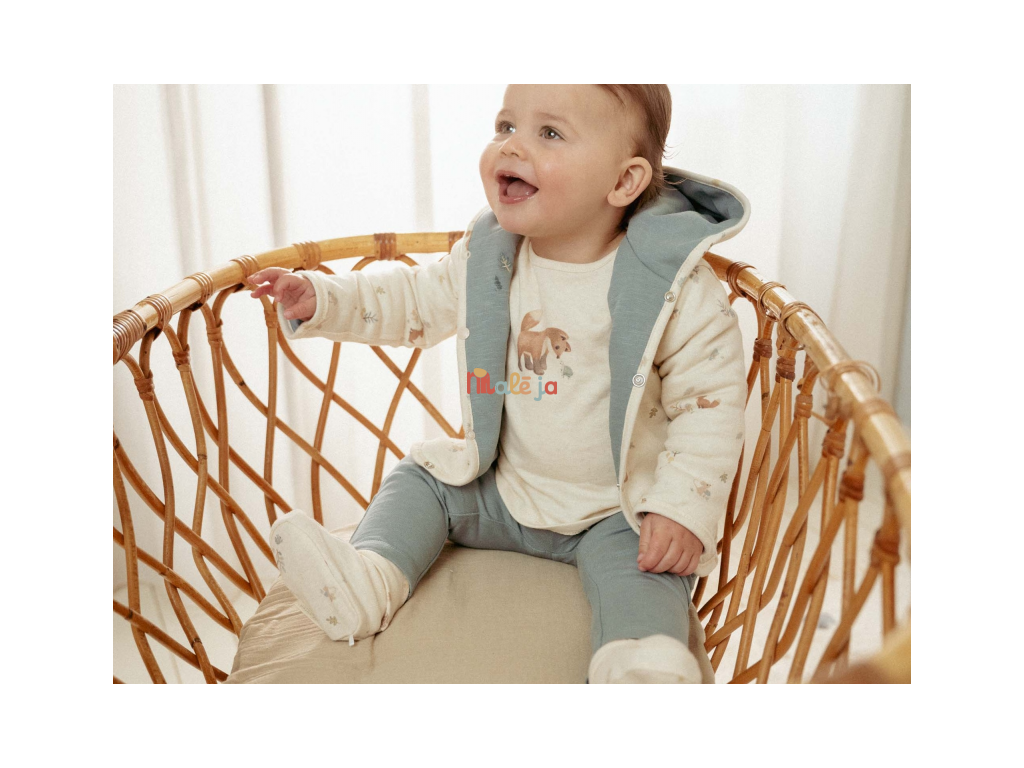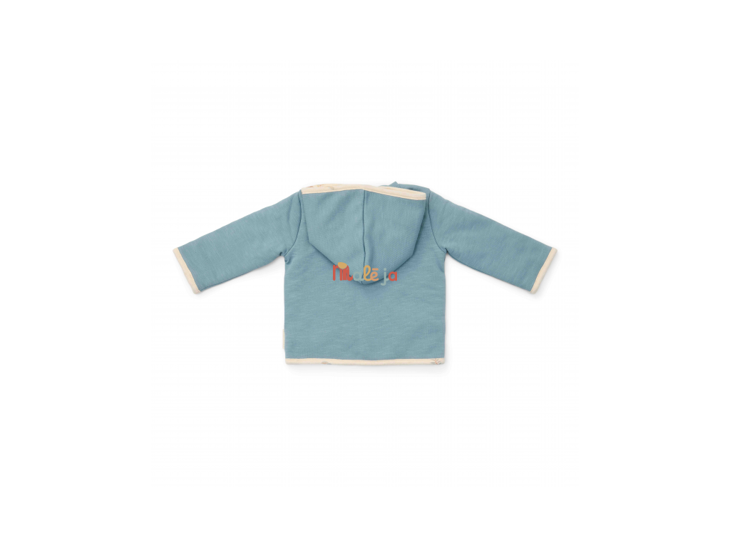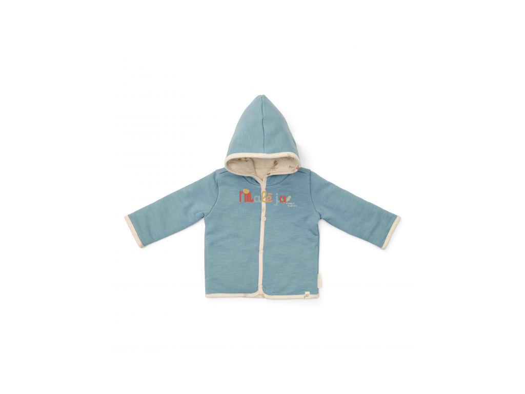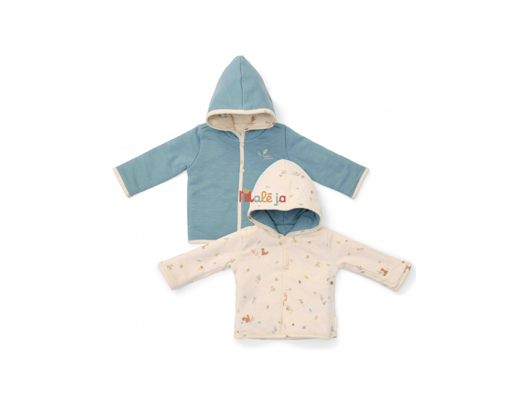Štýlový obojstranný kabátik z mäkkej organickej bavlny poskytne vášmu dieťaťu vďaka dvojitej vrstve teplo a pohodlie. Obojstranné prevedenie ponúka dve farebné varianty nosenia - modrú s výšivkou a krémovou s potlačou. Kabátik sa ľahko oblieka vďaka zapínaniu na patentky.