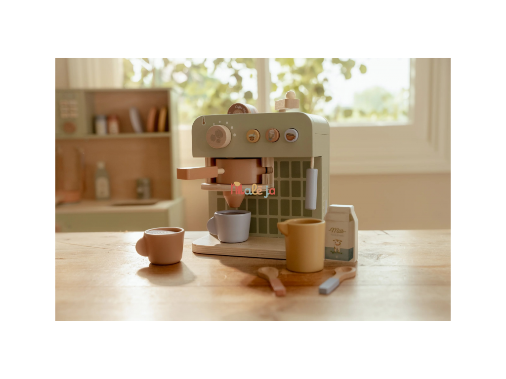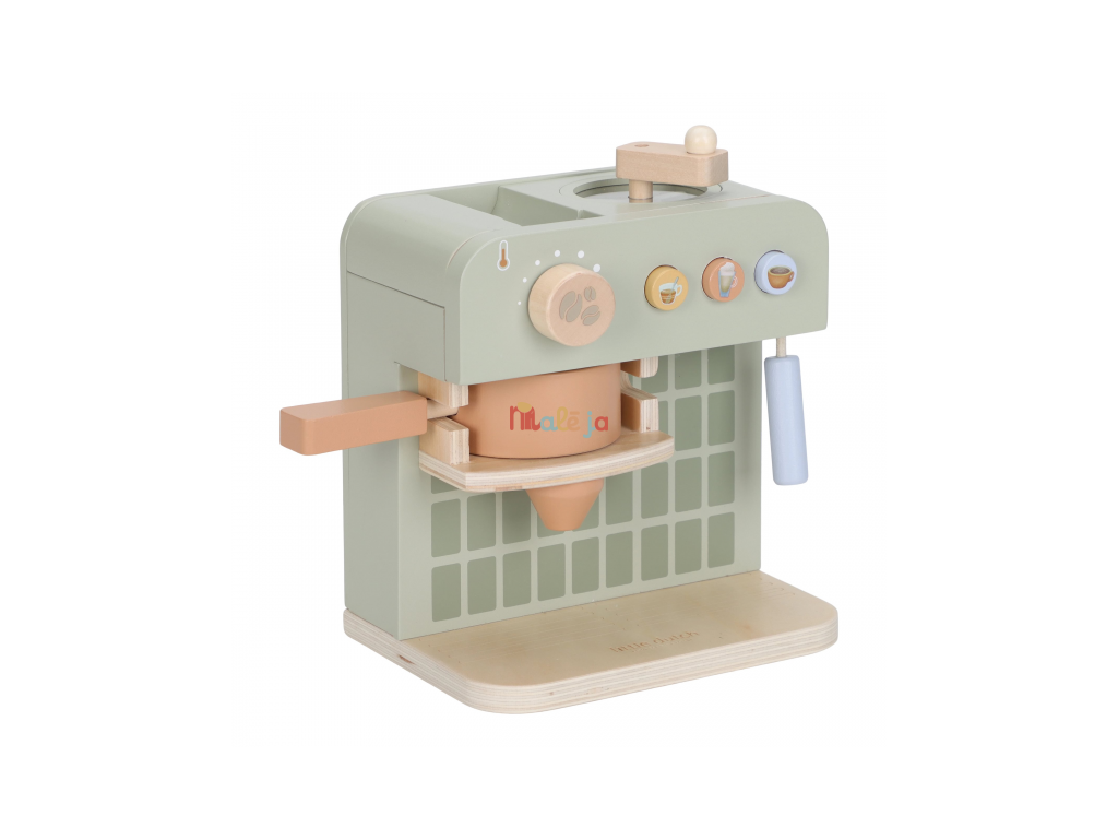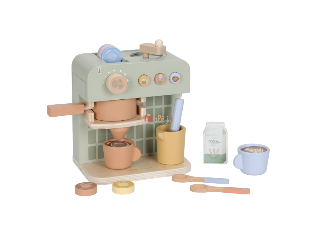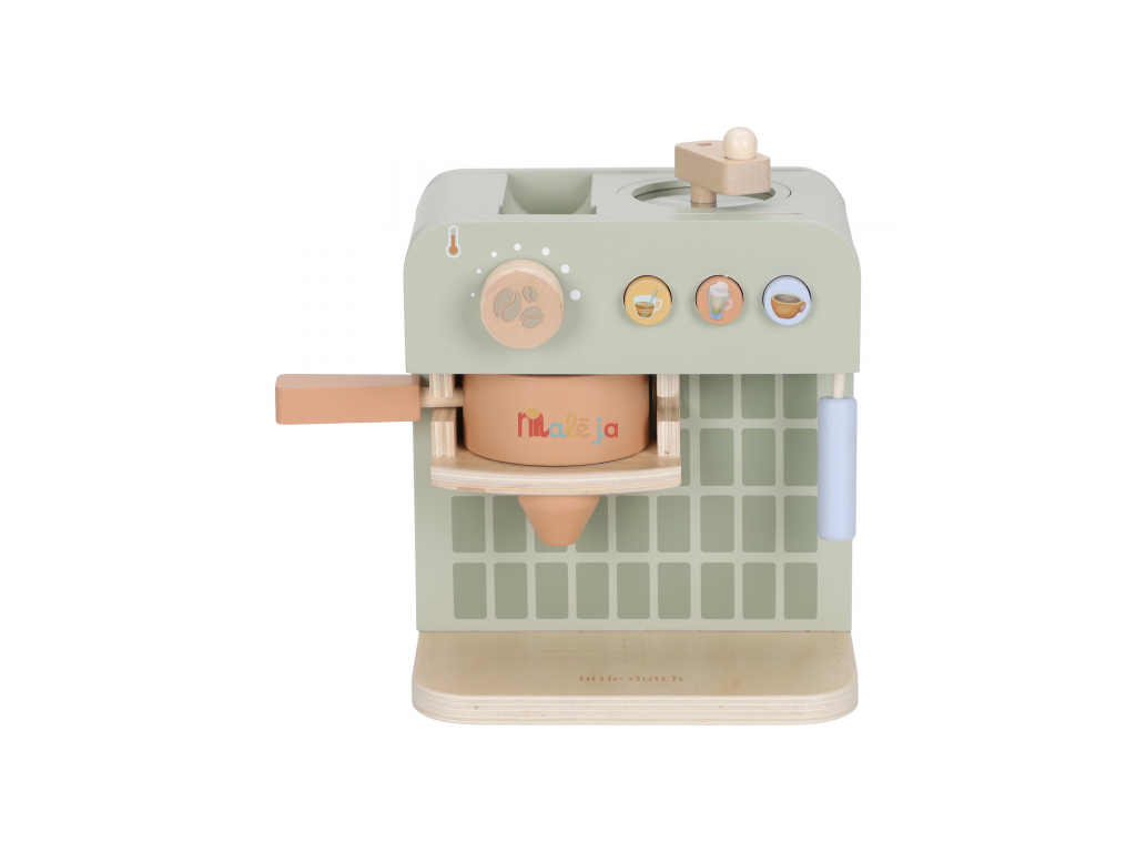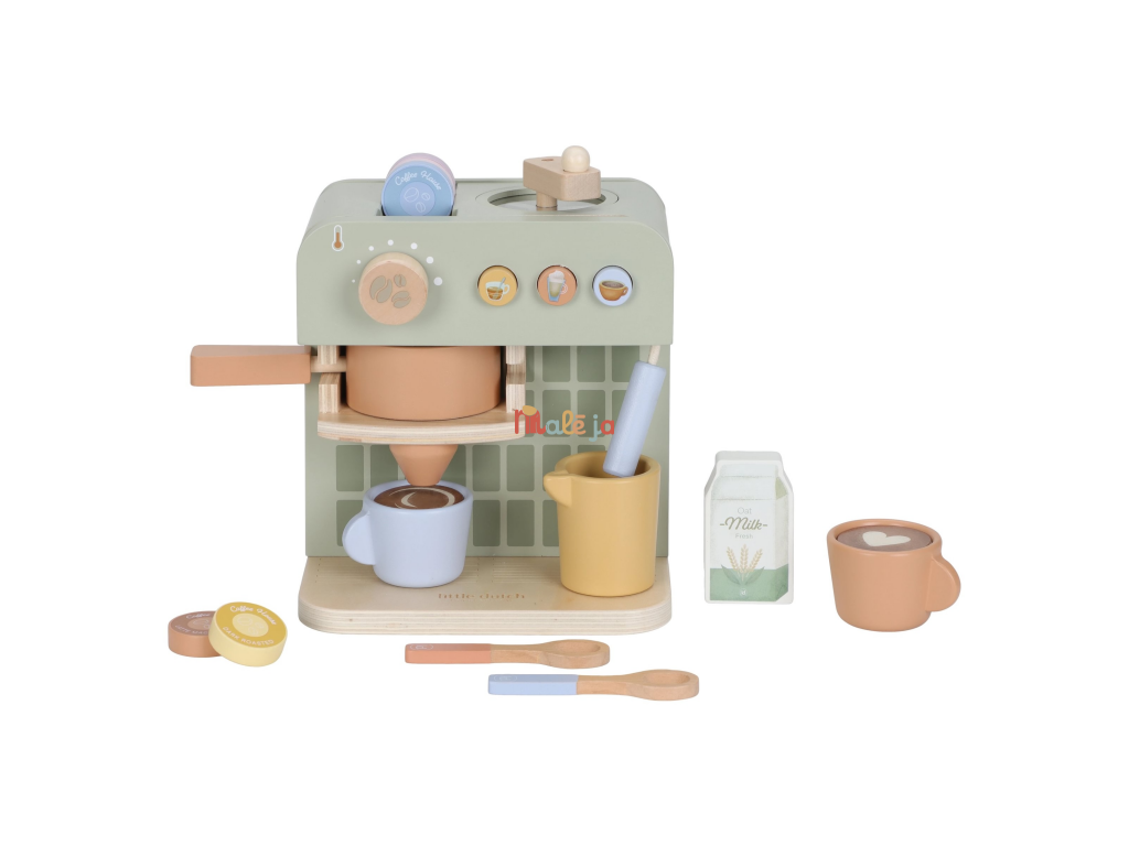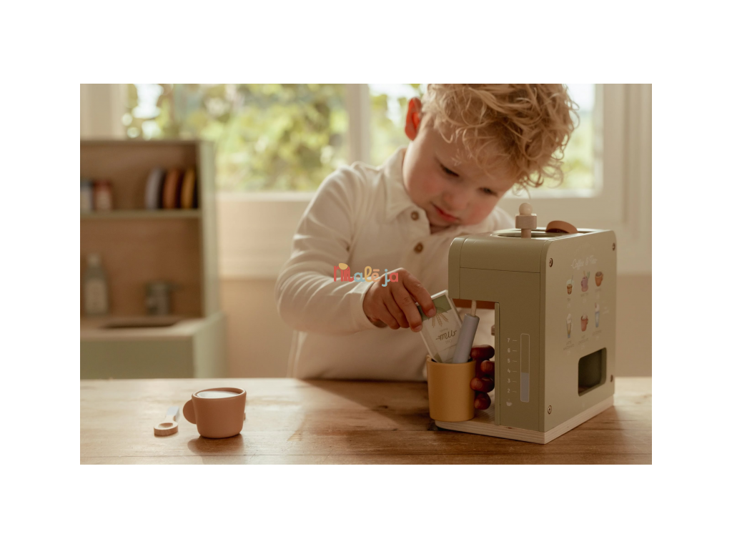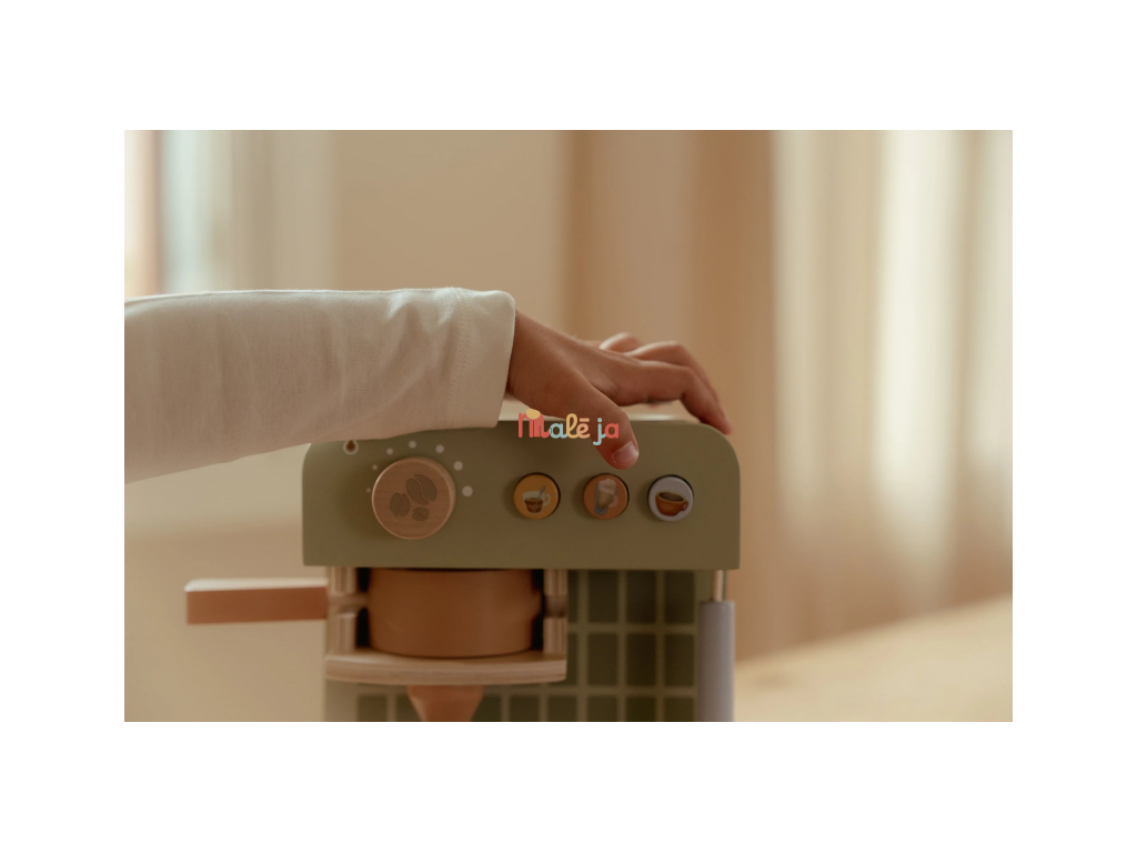 Na akú kávu máte dnes chuť? S týmto krásnym dreveným kávovarom sa z každého dieťaťa stane malý barista. Pre svojich hostí si môže namlieť kávu, vybrať kapsulu, naliať mlieko a ozdobiť nápoj podľa vlastnej fantázie.