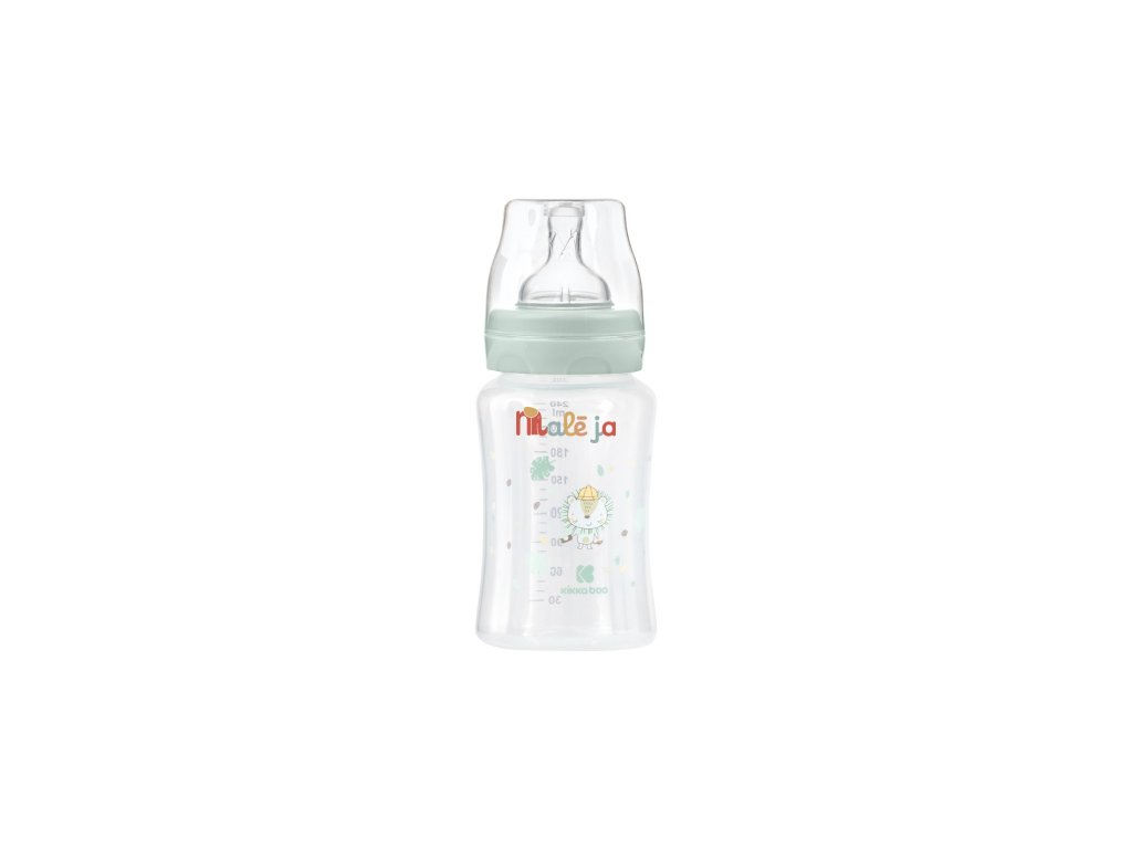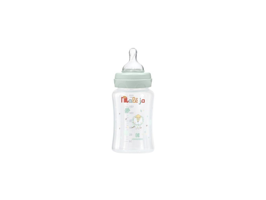 Dojčenská fľaša KikkaBoo s krásnou potlačou má antikolikový silikónový cumlík a viečko pre bezpečné uzavretie. Široké hrdlo uľahčuje čistenie fľaštičky.