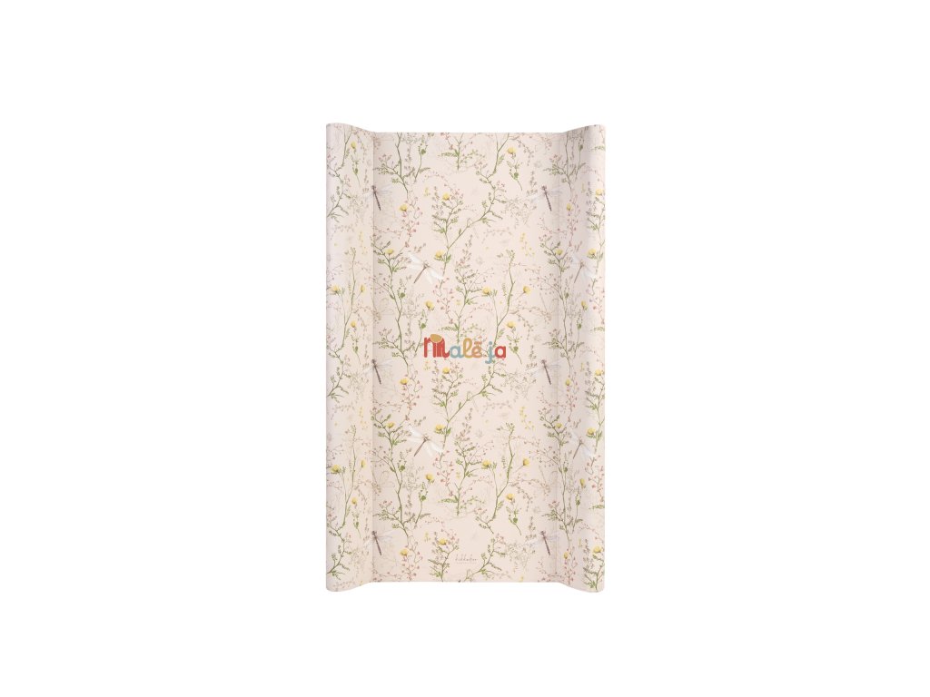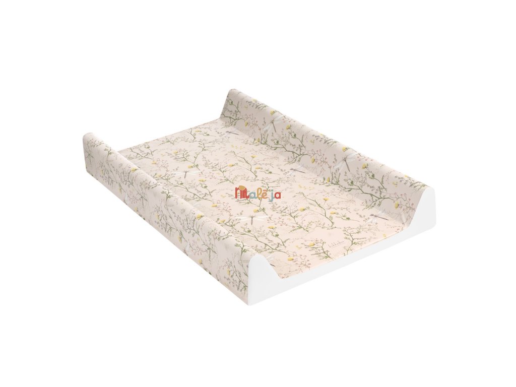 Mäkká prebaľovacia podložka s krásnou kvetinovou potlačou zaistí dieťaťu pohodlie počas prebaľovania. Vyvýšené bočné okraje pomáhajú udržať dieťa počas prebaľovania bezpečne na prebaľovacom pulte. Podložka je určená na použitie na pevnom rovnom podklade. Vodeodolný povrch ľahko očistíte utretím alebo umytím. Rozmery: 70 x 50 x 10 cm Hmotnosť: 0,55 kg Zloženie: poťah 100% PVC, výplň 67% polyester, 33% polyuretán Vyrobené z bezpečných materiálov v súlade s normou EN 71-1. Vhodné pre deti od narodenia do 12 mesiacov (do 11 kg).