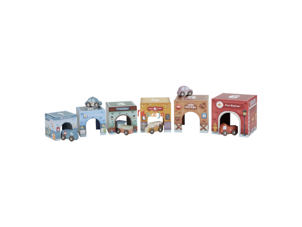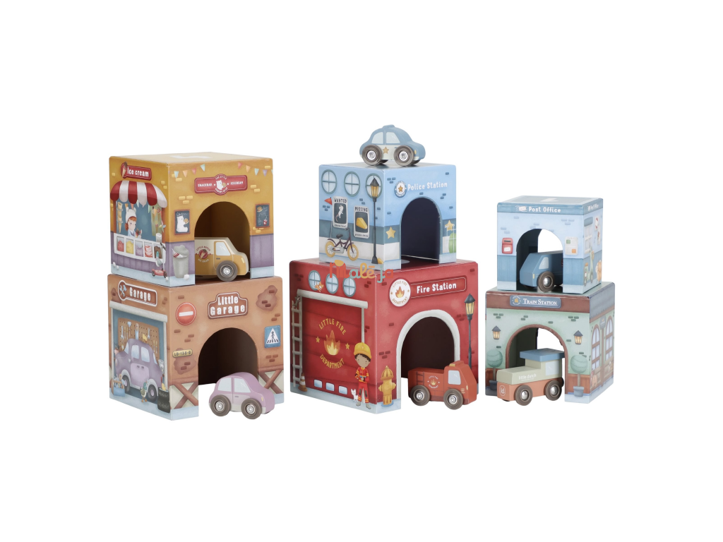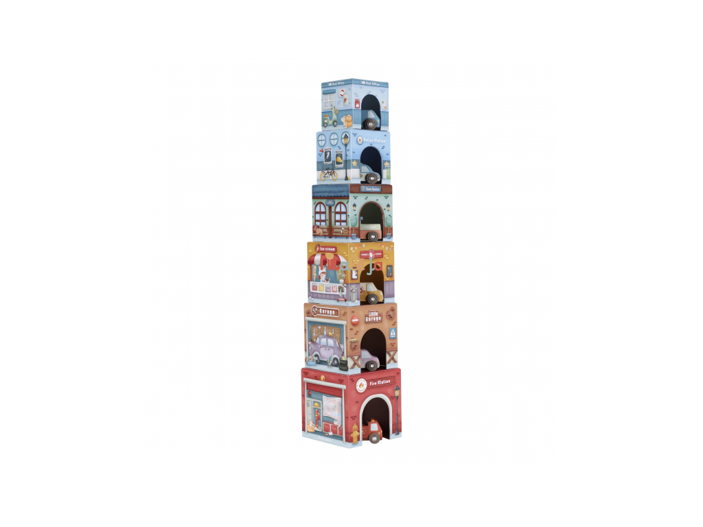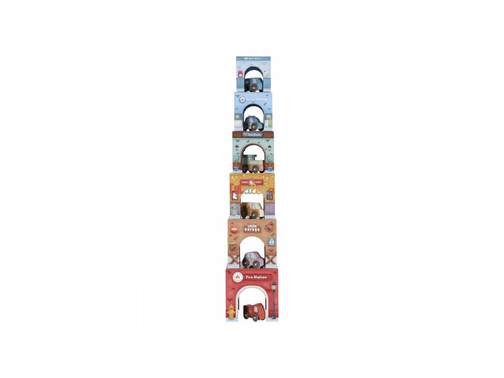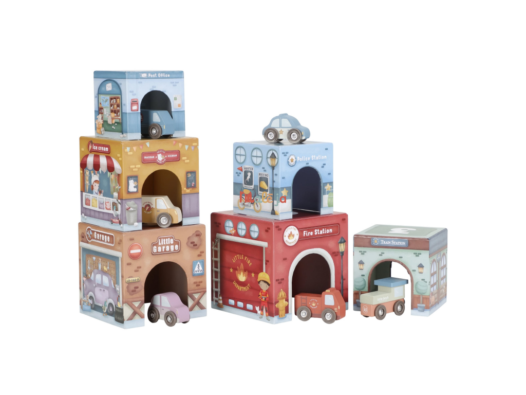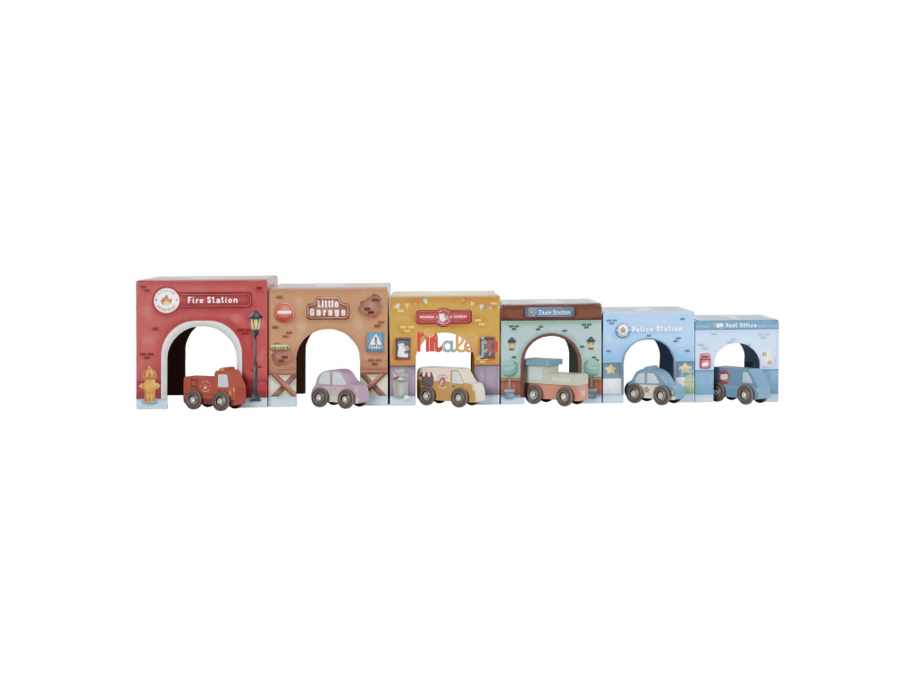 Stavať, objavovať a hrať sa! Táto nápaditá sada Little Duch obsahuje šesť ilustrovaných kartónových kociek rôznych veľkostí, ktoré predstavujú budovy ako požiarnu stanicu, garáž alebo poštu - ak nim 6 drevených vozidiel, patriacich k jednotlivým budovám.