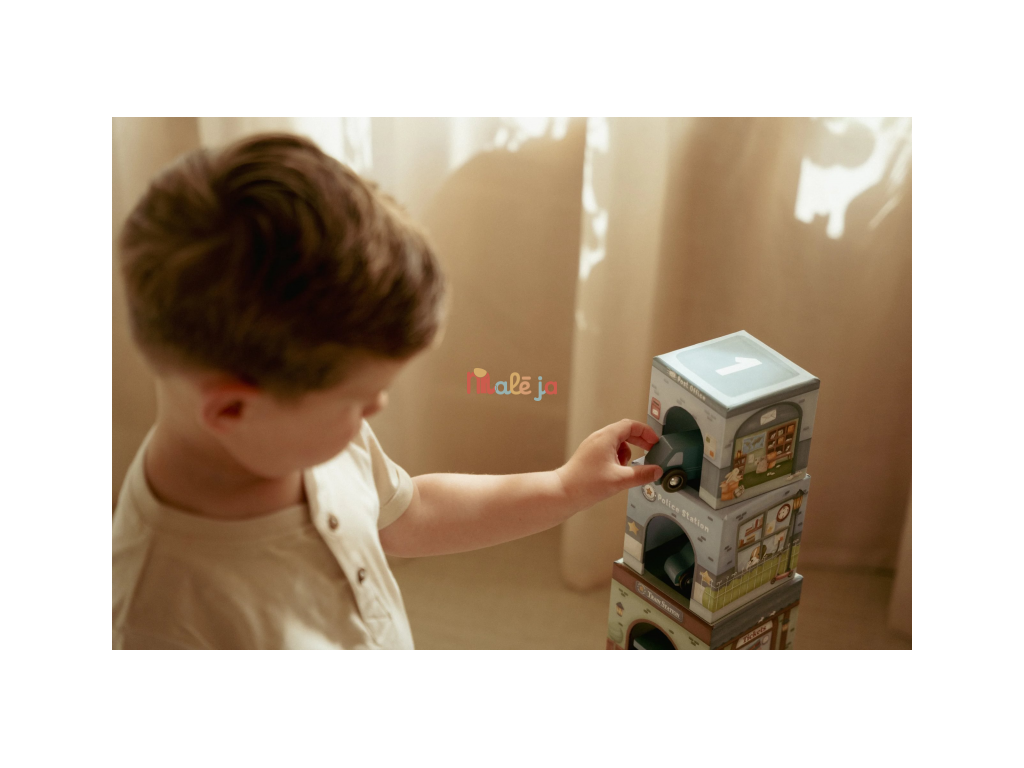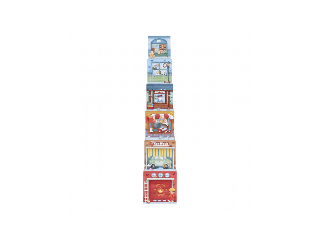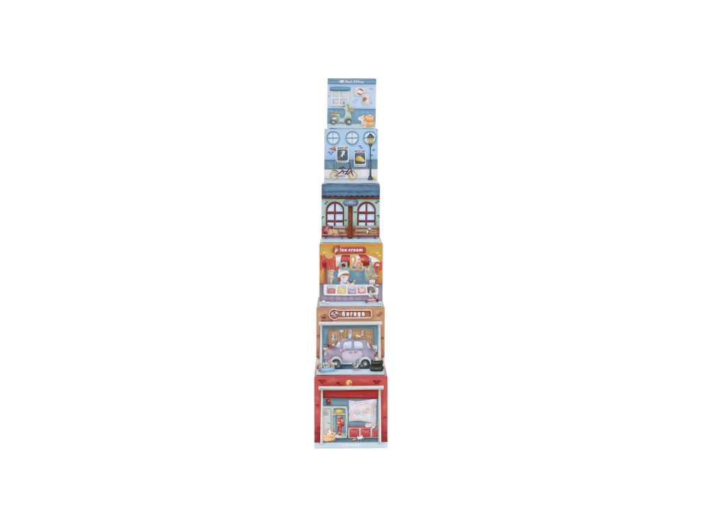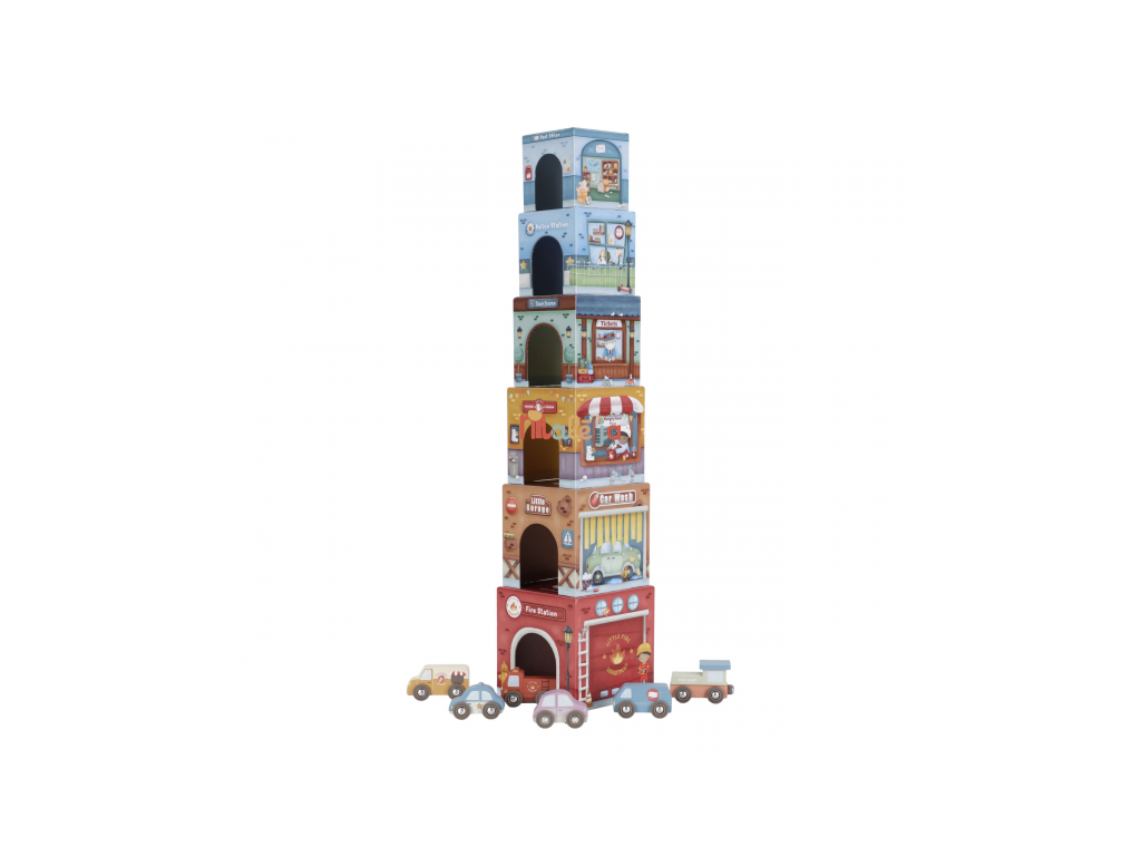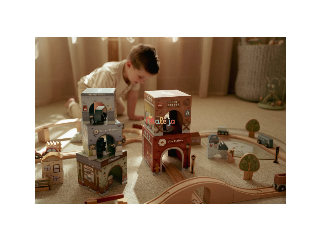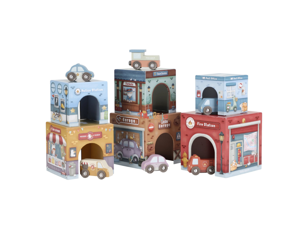 Stavať, objavovať a hrať sa! Táto nápaditá sada Little Duch obsahuje šesť ilustrovaných kartónových kociek rôznych veľkostí, ktoré predstavujú budovy ako požiarnu stanicu, garáž alebo poštu - ak nim 6 drevených vozidiel, patriacich k jednotlivým budovám.