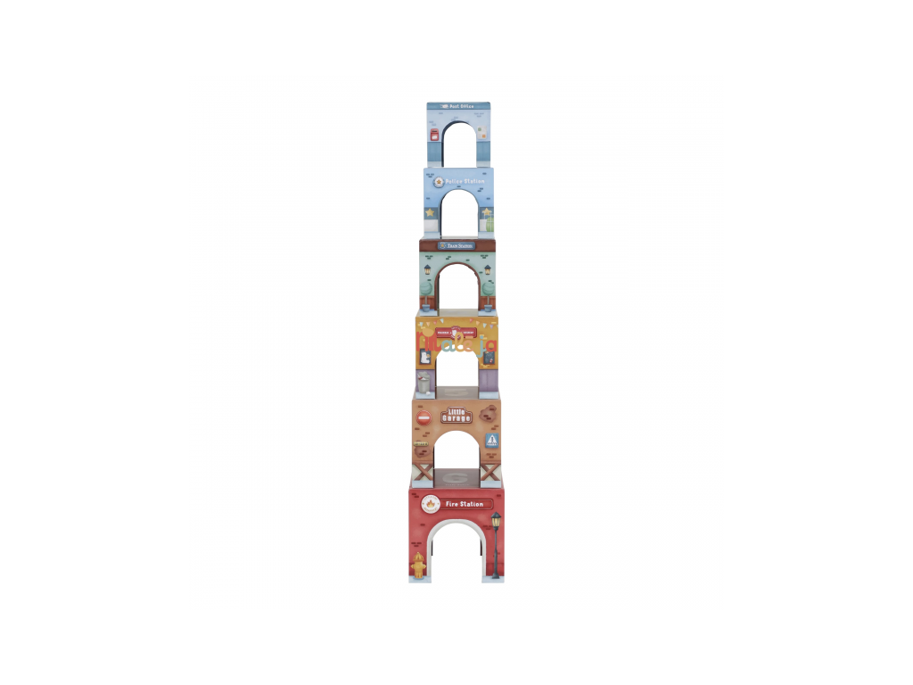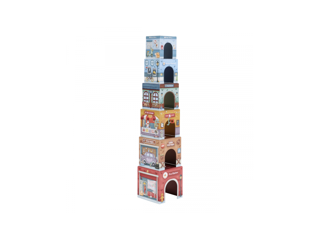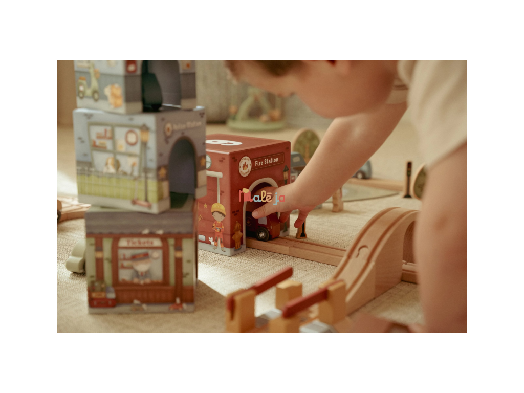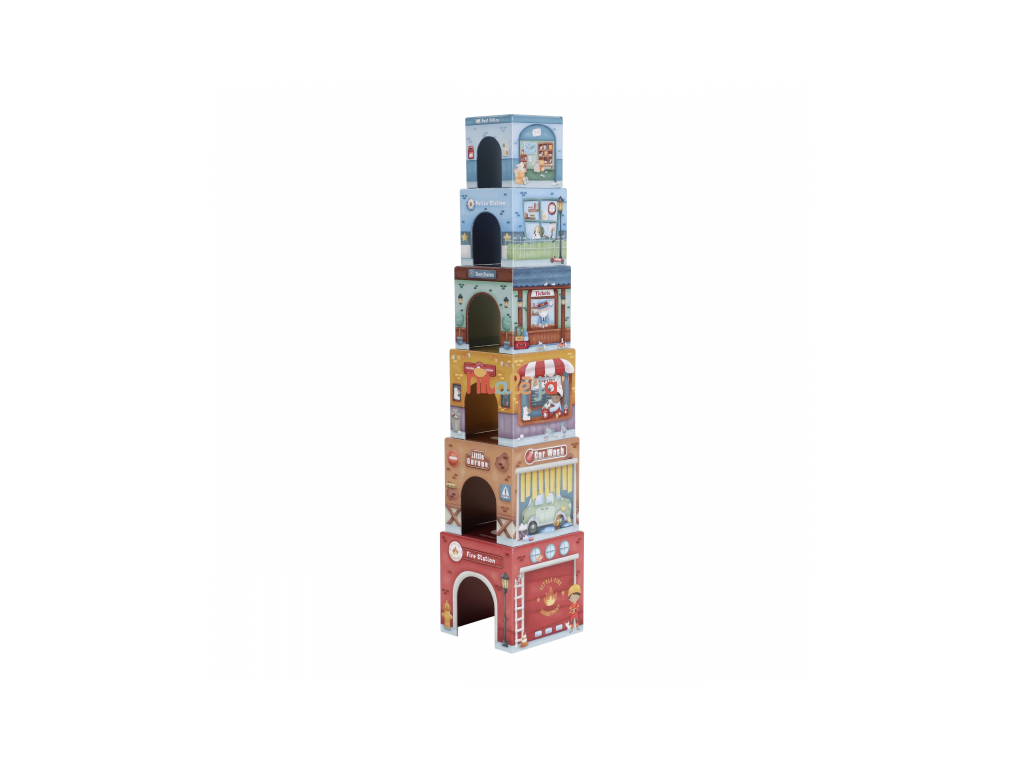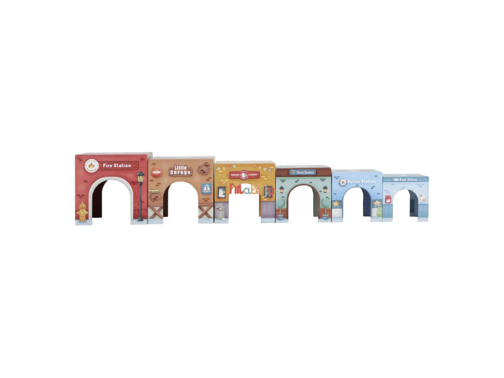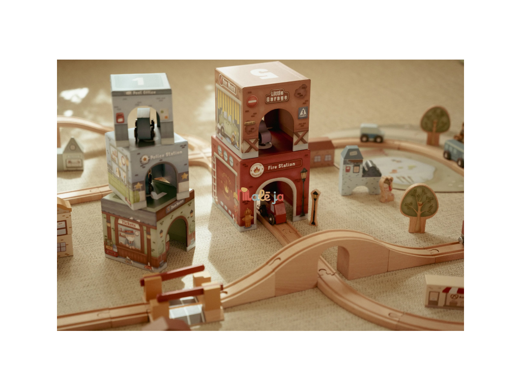 Stavať, objavovať a hrať sa! Táto nápaditá sada Little Duch obsahuje šesť ilustrovaných kartónových kociek rôznych veľkostí, ktoré predstavujú budovy ako požiarnu stanicu, garáž alebo poštu - ak nim 6 drevených vozidiel, patriacich k jednotlivým budovám.