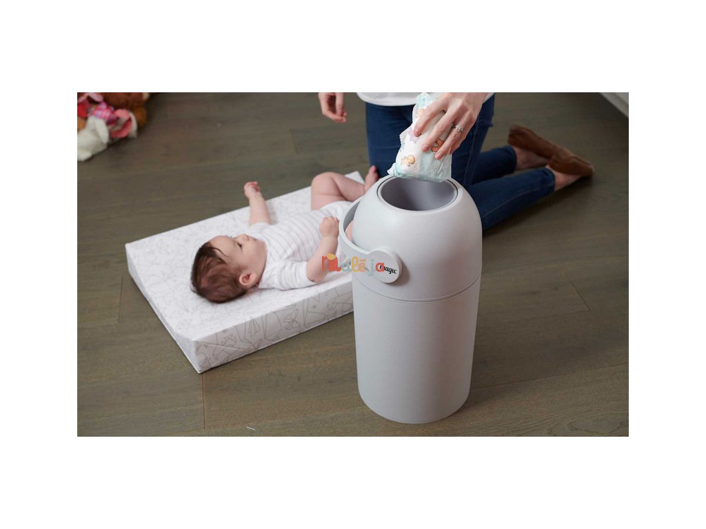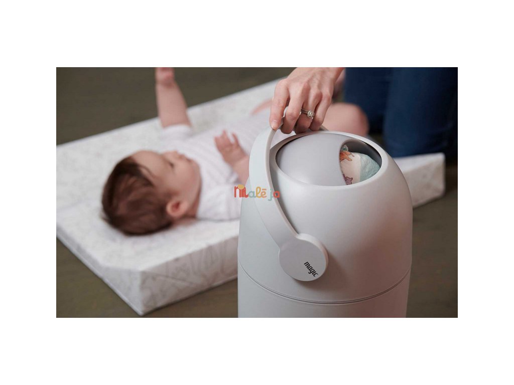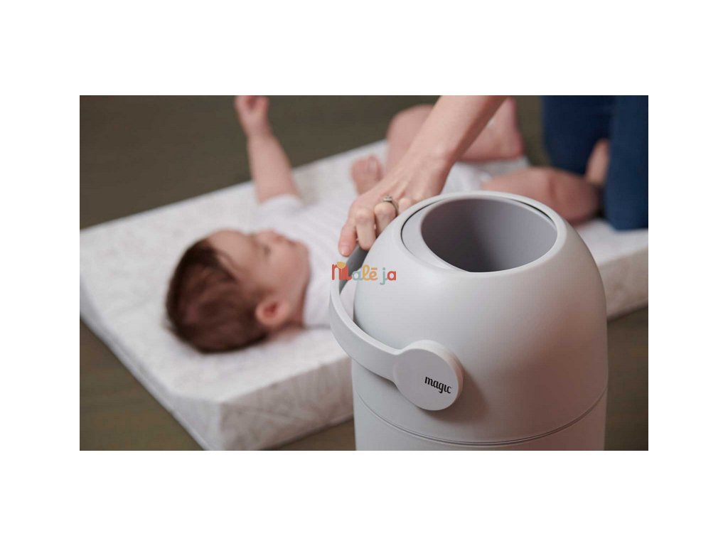 Patentovaný kôš na plienky Magic poskytuje ochranu pred nepríjemnými pachmi a baktériami v detskej izbe alebo kdekoľvek vo vašom interiéri. Použitú plienku ľahko vložíte do koša bez akéhokoľvek kontaktu s plienkami, ktoré už v koši sú. Otočením držadla plienka prepadne do koša a jeho otočením späť je kôš opäť pripravený na ďalšie použitie. To všetko jednou rukou, takže druhou môžete držať vaše bábätko. Špeciálny systém tesnenia udržuje zápach vo vnútri koša. Kôš s objemom 40 l pojme cca 25 plienok (počet plienok záleží na ich veľkosti), takže vám jeho kapacita vystačí na niekoľko dní. Aj vyprázdnenie koša je navrhnuté tak, aby sa neuvoľnil zápach v koši nahromadený. Kôš v modernom, minimalistickom dizajne dokonale zapadne do každého interiéru. Keď dieťa vyrastie, môžete kôš aj naďalej používať na odpadky. Kôš je vybavený aj detskou poistkou. Použitie koša je veľmi ekonomické, pretože nevyžaduje nákup špeciálnych náplní. Kôš je určený na použitie s bežnými vreckami na odpadky. Pre maximálnu ochranu pred zápachom odporúčame použitie originálnych vrecúšok navrhnutých do košov na plienky Magic. Tieto vrecká sú vyrobené z extra silného, 3-vrstvového materiálu, ktorý bráni pretekaniu. Samostatne predávané balenie obsahuje 45 ks sáčkov (3 rolky / 15ks) z recyklovaného materiálu. Balenie koša obsahuje rolu s 15 ks sáčkov zadarmo. Jedna rola vystačí na cca 375 plienok (počet plienok záleží na ich veľkosti). Materiál: PP Rozmery: 52 x 26 cm