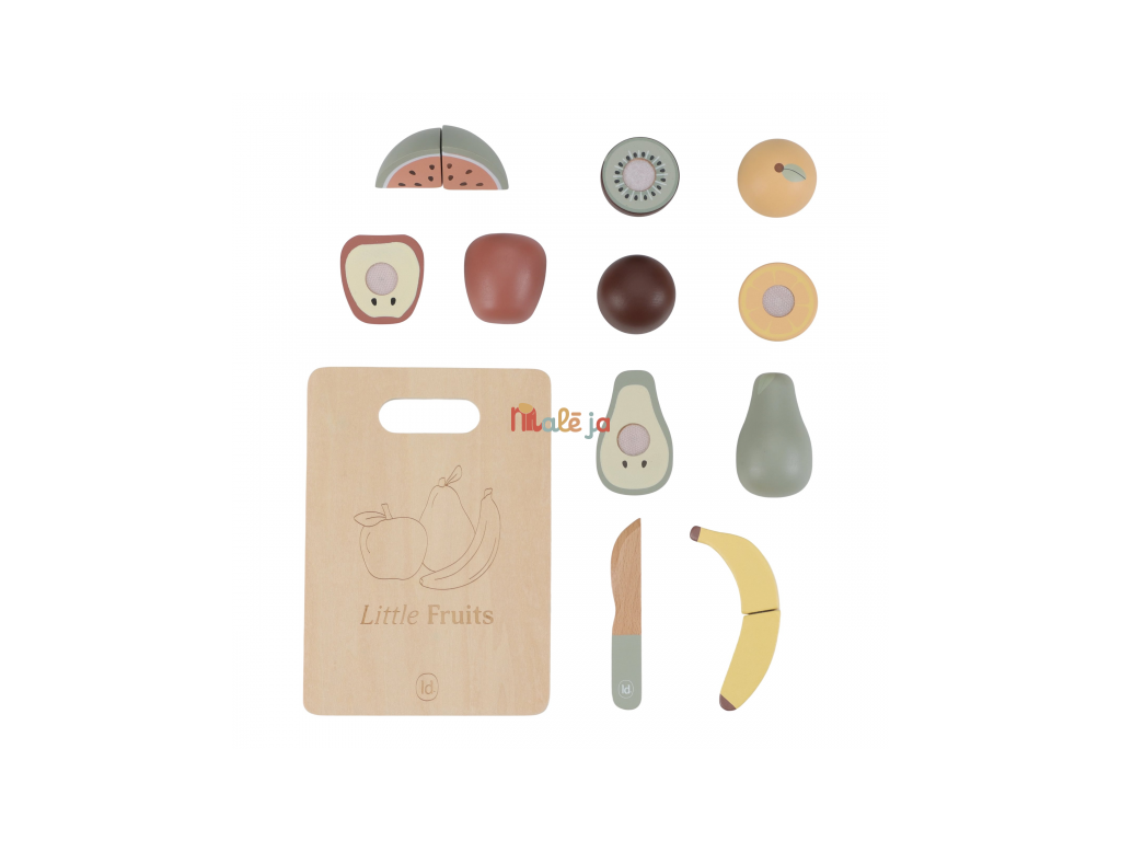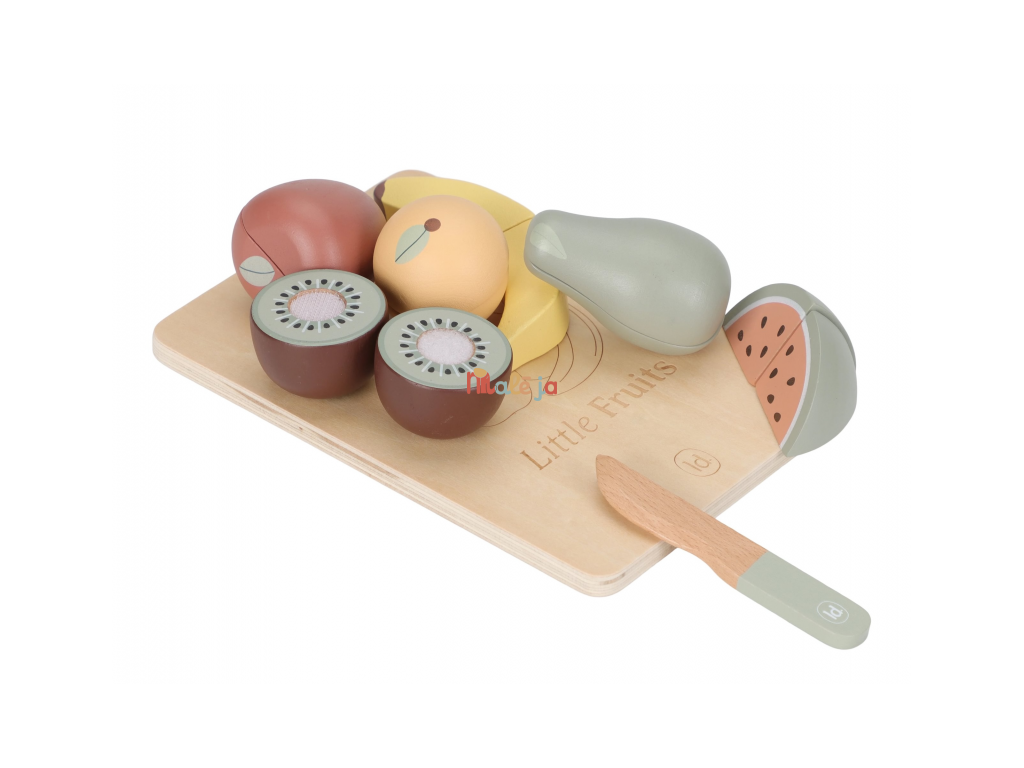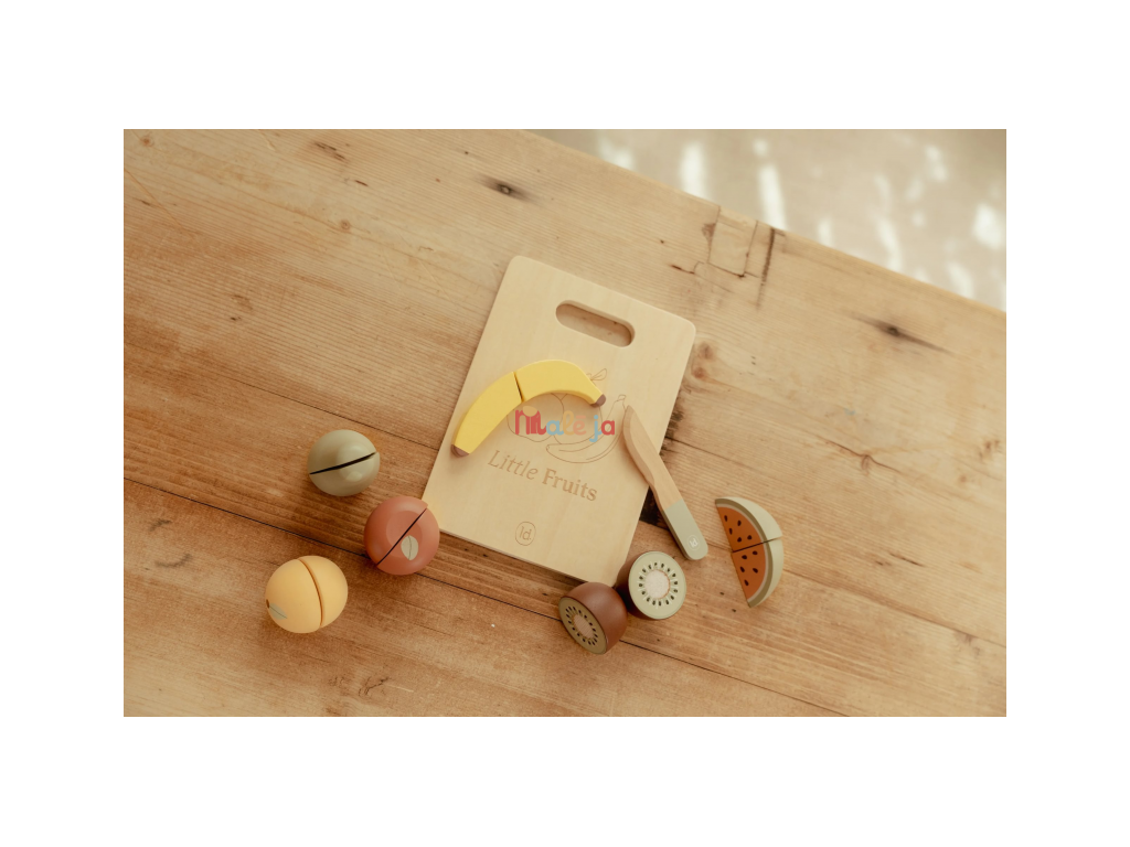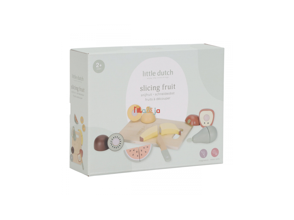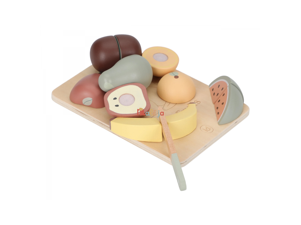 Pripravte ovocnú desiatu s touto veselou sadou dreveného krájacieho ovocia! V sade nájdete šesť druhov ovocia: jablko, hrušku, banán, kivi, pomaranč a kúsok melónu – každý z nich je možné rozkrojiť dreveným nožíkom na dve polovice a vďaka suchému zipsu ich opäť ľahko spojíte späť.