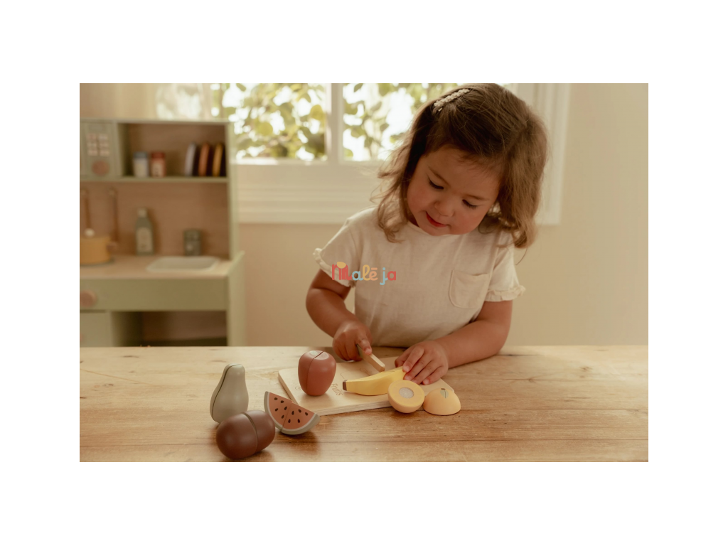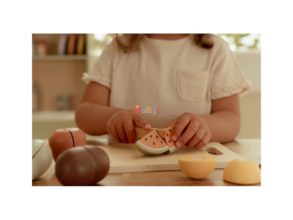 Súčasťou sady je aj doska na krájanie a drevený nôž, takže si malí kuchári môžu vyskúšať prípravu zdravej desiaty presne ako dospelí. Skvelý spôsob, ako rozvíjať jemnú motoriku, koordináciu ruky a oka aj hru na role.