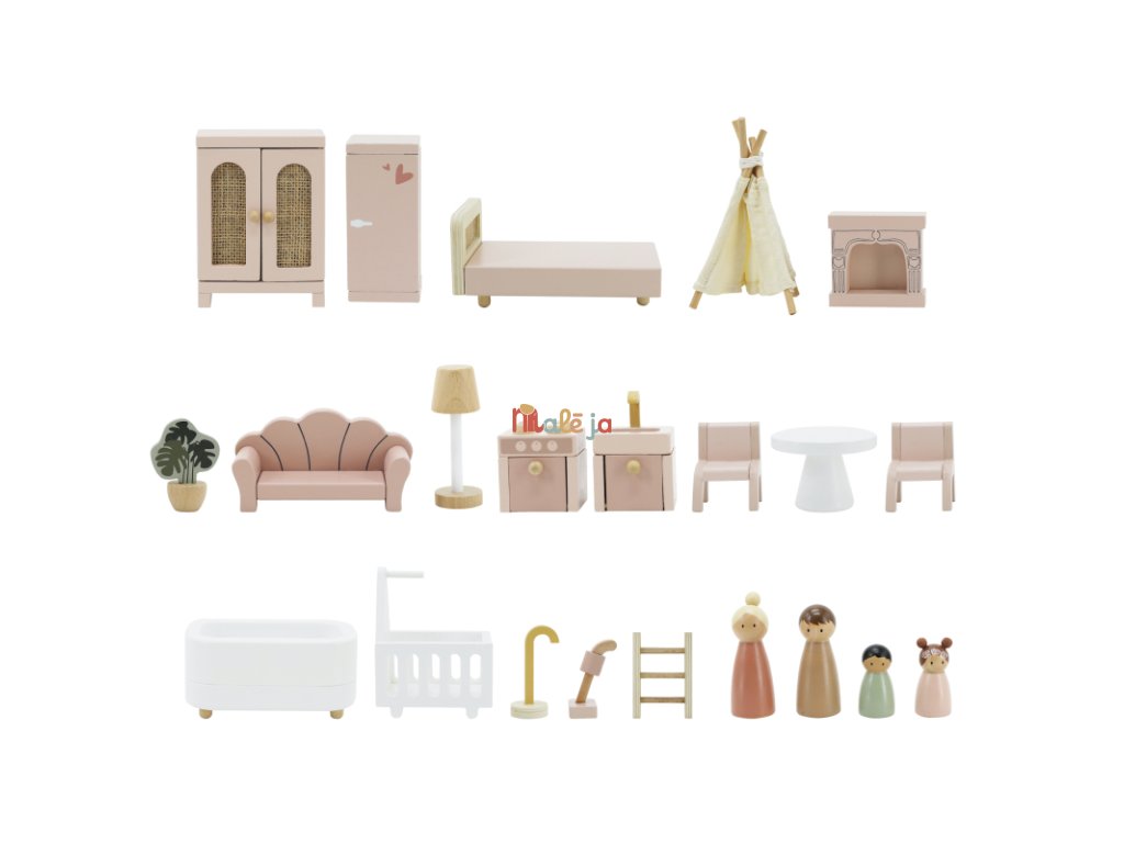 Domček je dodávaný s kompletným vybavením, ktoré deti potrebujú na vytvorenie vlastného malého sveta. Nájdete v ňom šatníkovú skriňu, posteľ, pohovku, kuchynku, stôl, stoličky, vaňu, vysávač a mnoho ďalšieho.