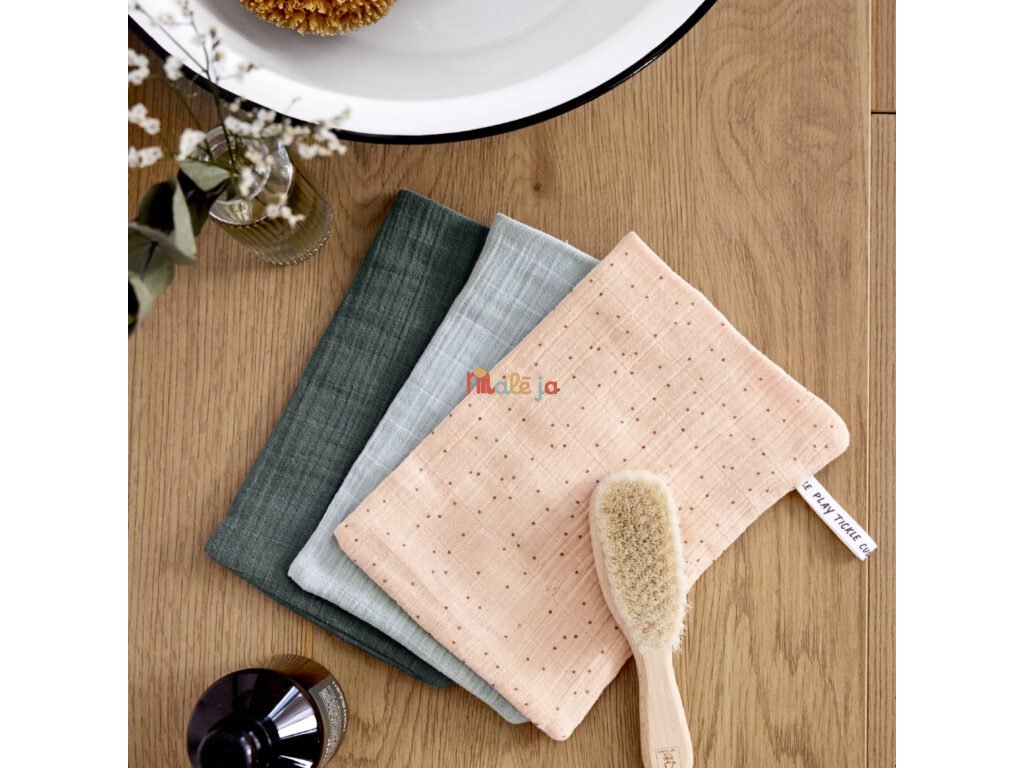 Umývacie rukavice sú pomocníkom pre každodennú starostlivosť o bábätko, pretože sú priedušné a veľmi jemné k pokožke dieťaťa. Sú vyrobené z dvojvrstvového predpraného mušelínu, sú priedušné a veľmi jemné k pokožke dieťaťa. Set 3 umývacích rukavíc môže byť použitý tak k umývaniu tváričky, tak k umývaniu celého tela dieťatka. Sú určené tak novorodencom, tak deťom do 3 rokov. Rukavice majú mnohostranné využitie, možno ich rovnako využiť napr. pri domácich prácach.