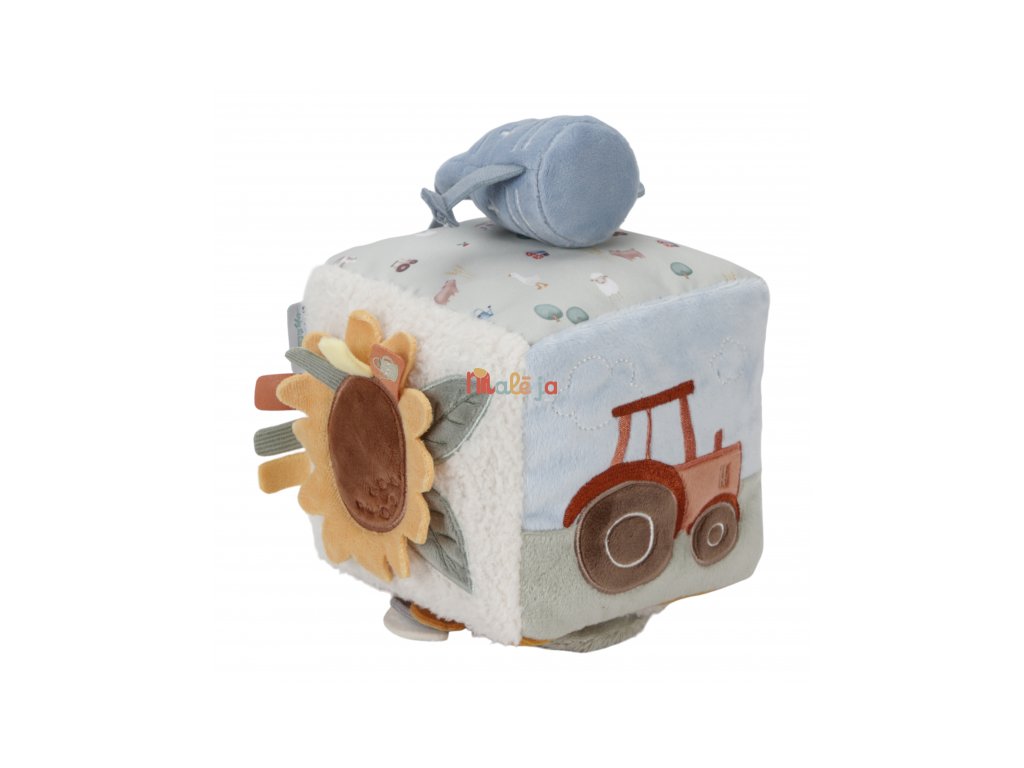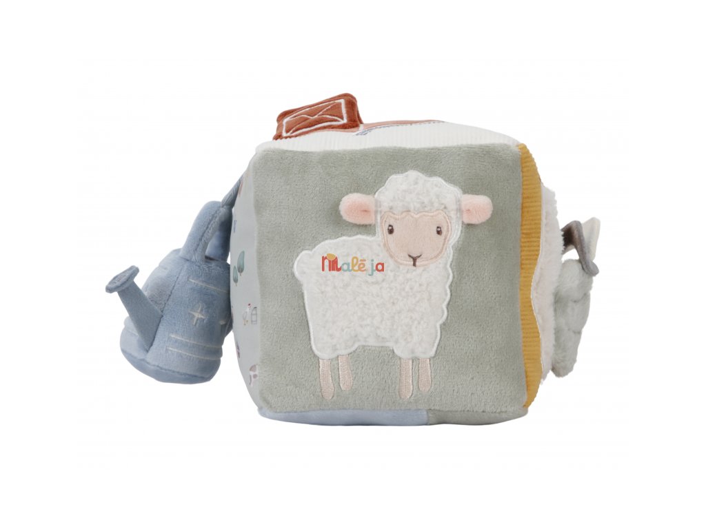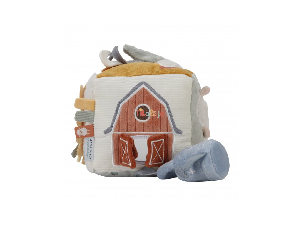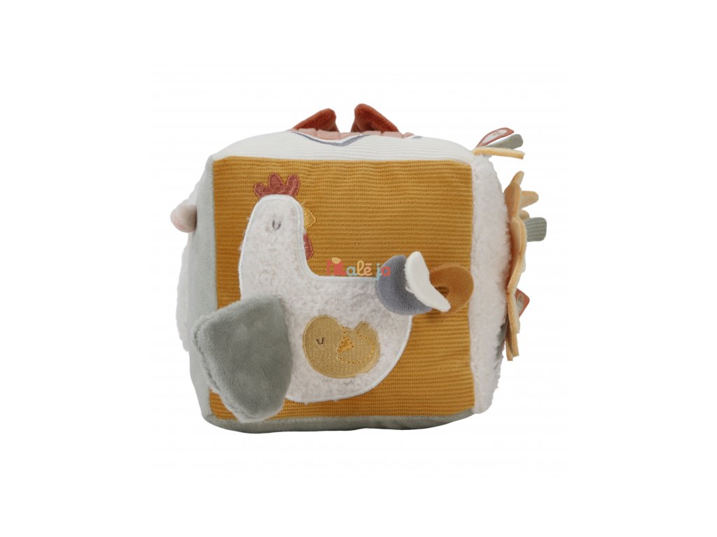 Mäkká plyšová kocka je vďaka svojmu prevedeniu ľahko uchopiteľná malými detskými ručičkami. Rôznorodé textúry, pripevnené hračky a vyšívané ilustrácie motívov zo života na farme lákajú dieťa na skúmanie, kocka navyše pri pohybe jemne cinká.