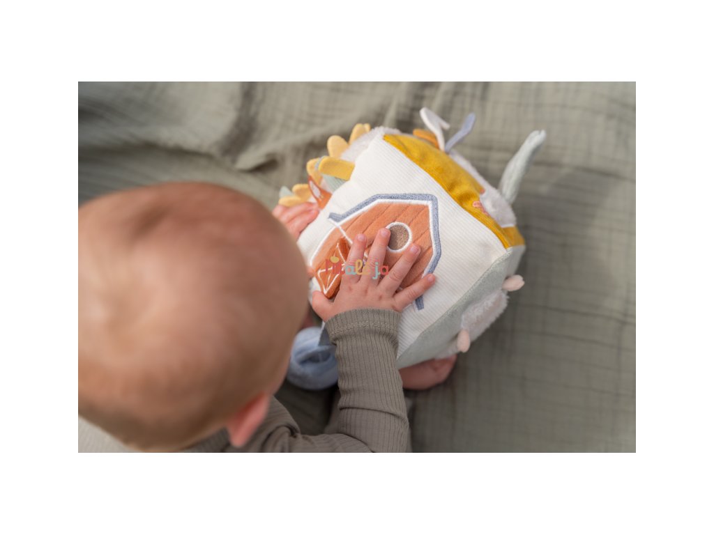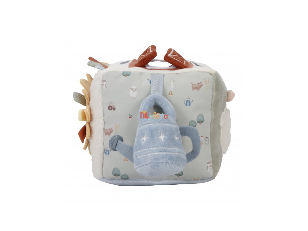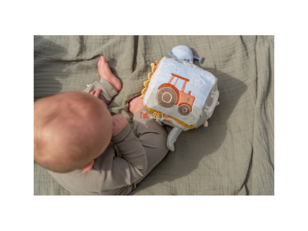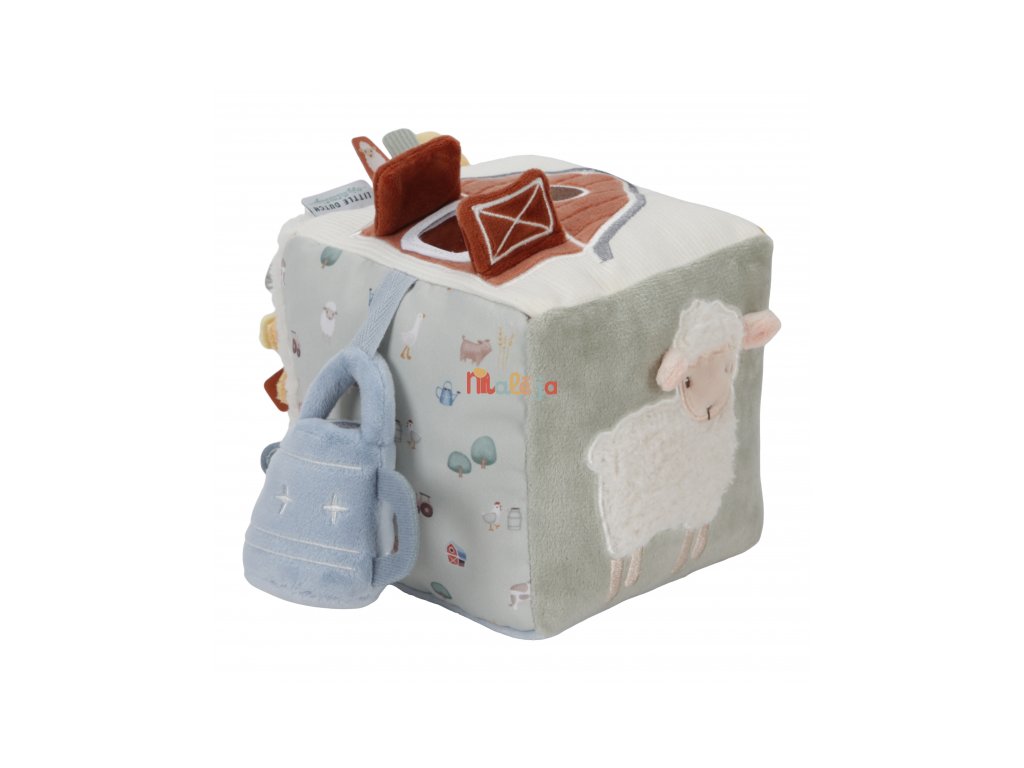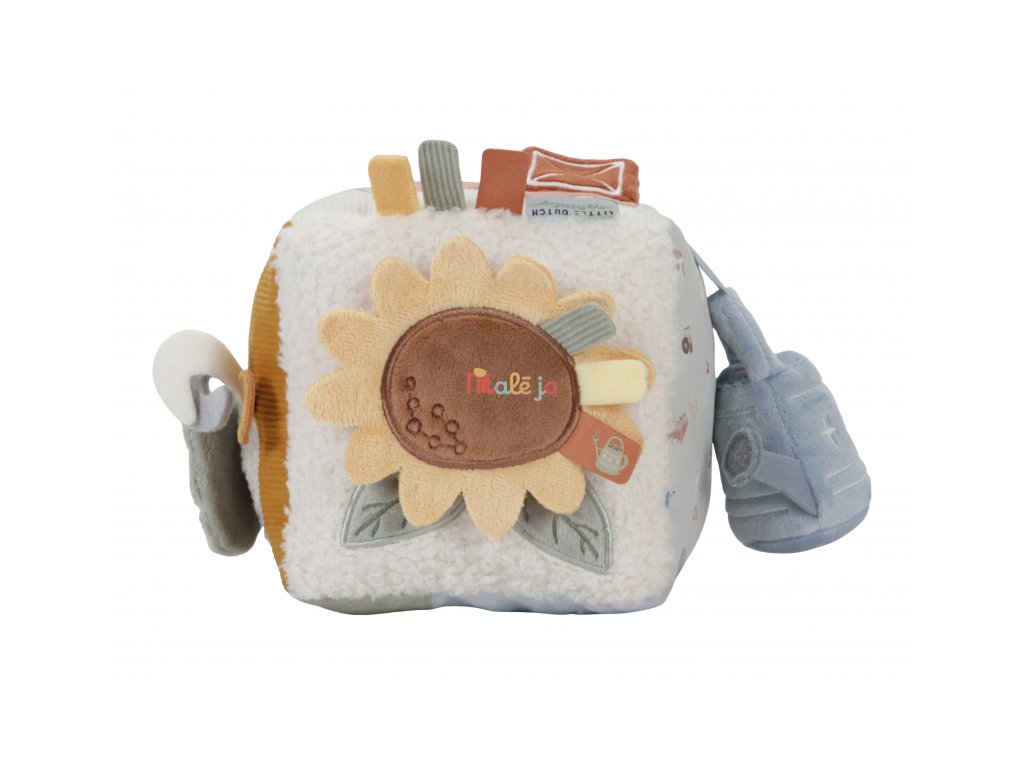Mäkká plyšová kocka je vďaka svojmu prevedeniu ľahko uchopiteľná malými detskými ručičkami. Rôznorodé textúry, pripevnené hračky a vyšívané ilustrácie motívov zo života na farme lákajú dieťa na skúmanie, kocka navyše pri pohybe jemne cinká.