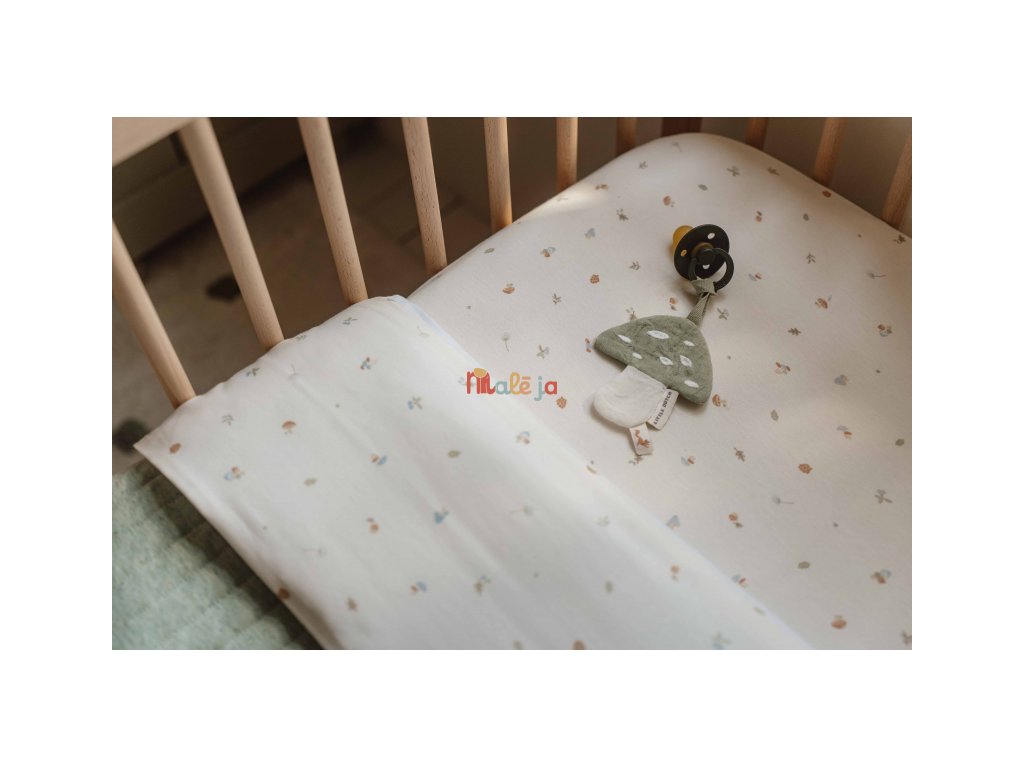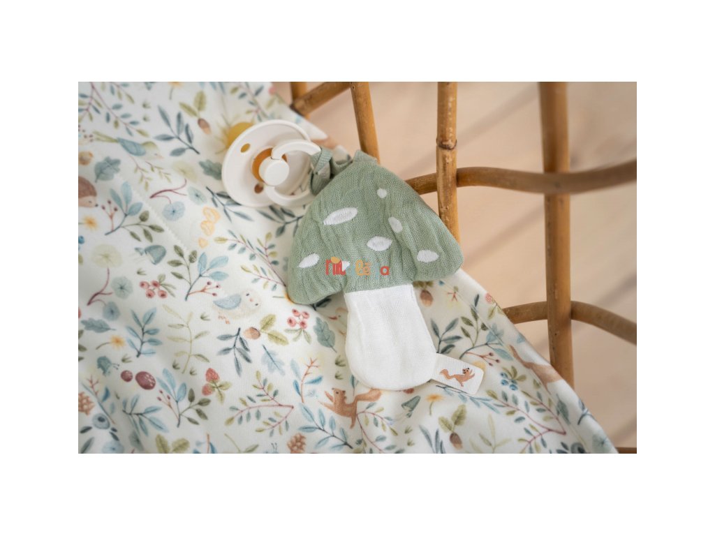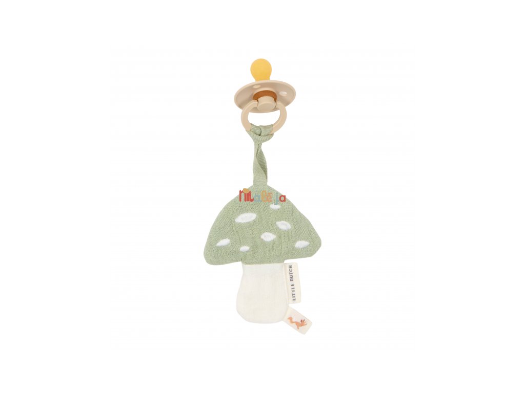 Prívesok z jemného mušelínu v podobe huby s úchytom pre cumlík láka dieťa na hranie i skúmanie a rodičom pomôže rýchlo nájsť cumlík v postieľke či kočíku.