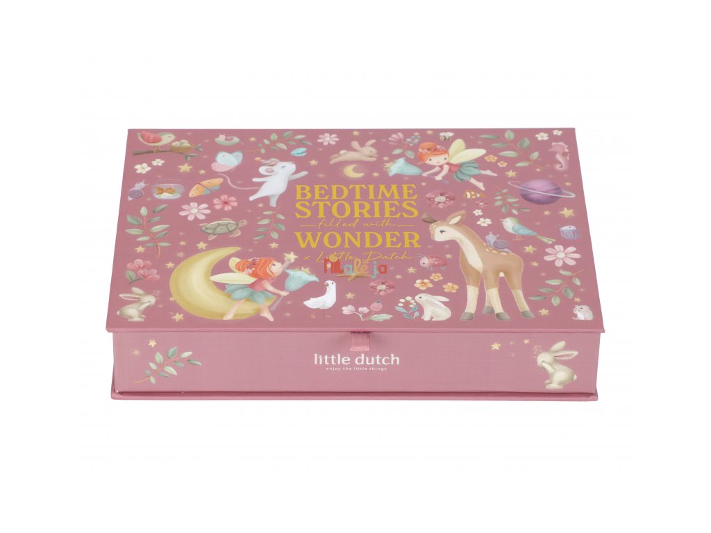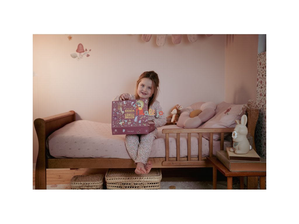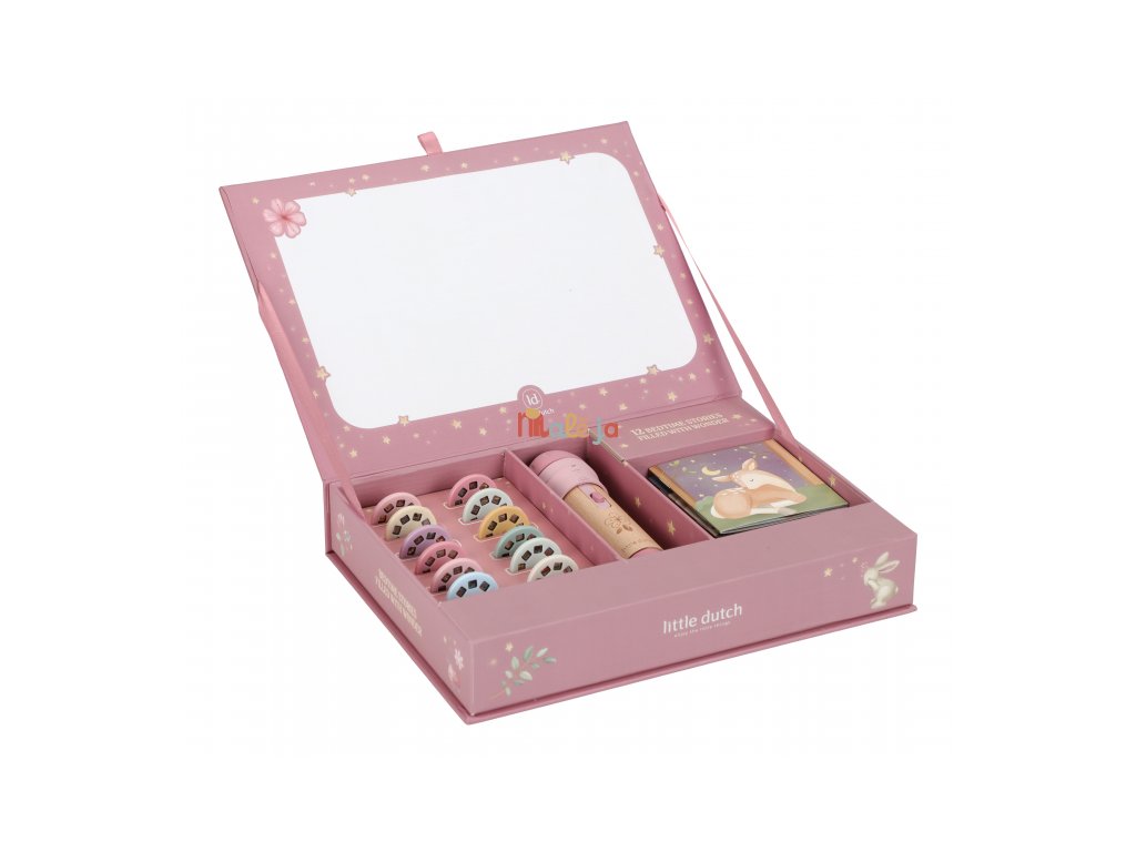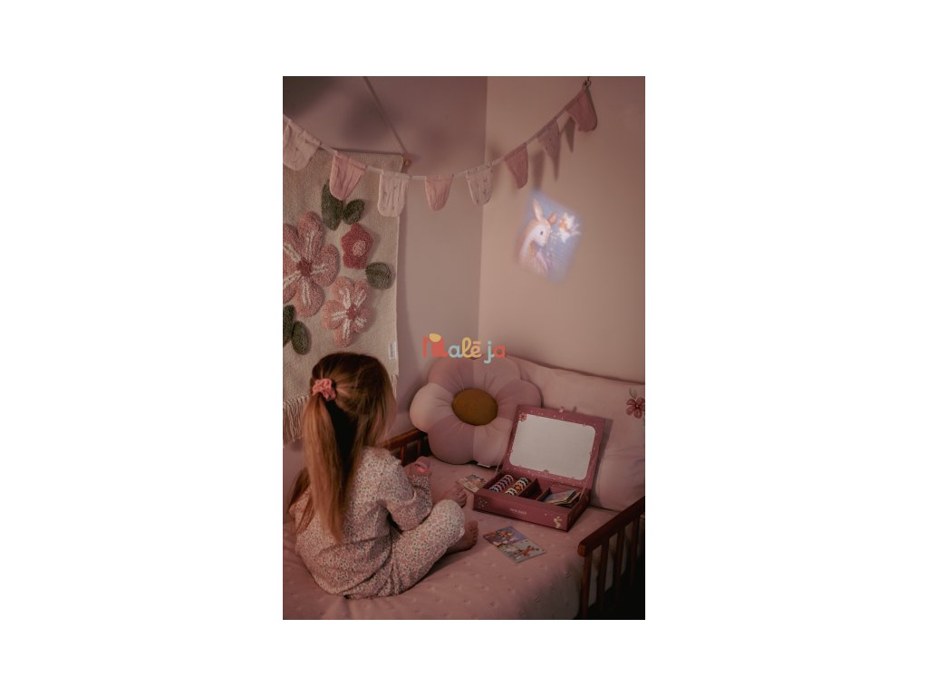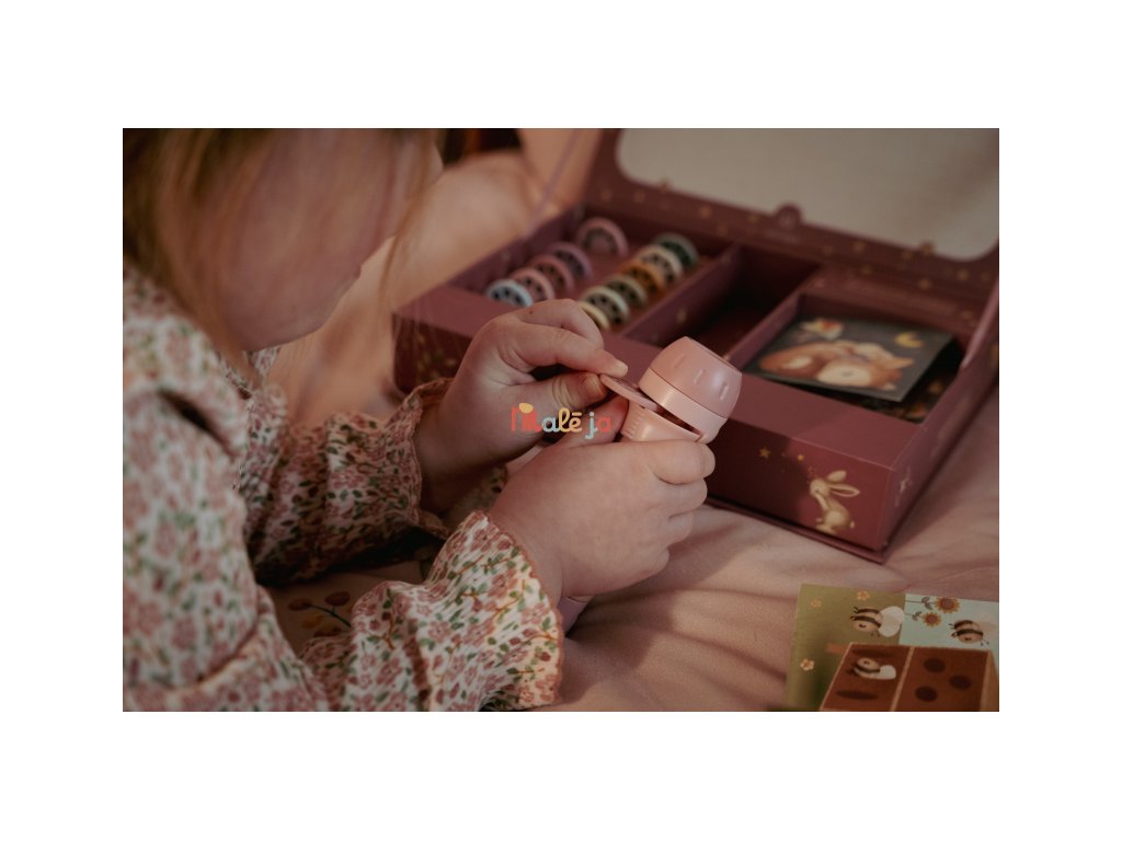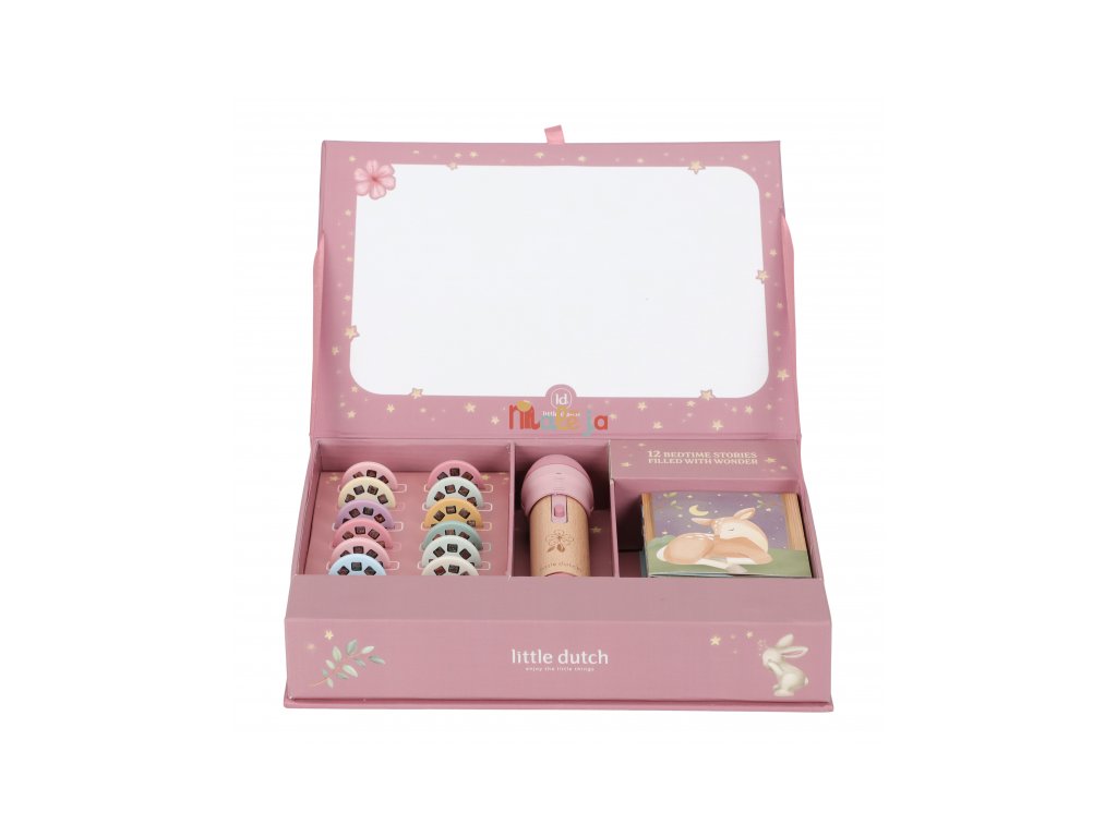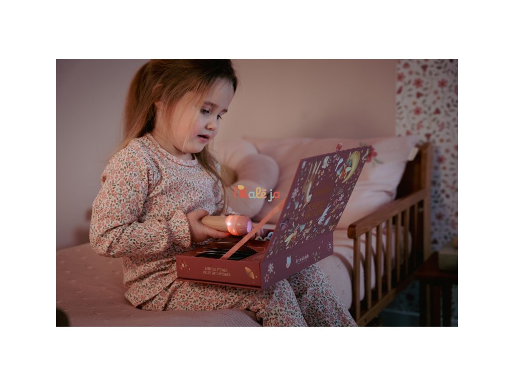 Projektor má pevnú drevenú rukoväť a funguje na batérie, takže si ho deti môžu vziať kamkoľvek so sebou. Po skončení príbehu je možné baterku aj všetko príslušenstvo ľahko uložiť do krásneho úložného boxu. Ideálny pre upokojujúci rituál pred spaním alebo príjemné spoločné chvíle.