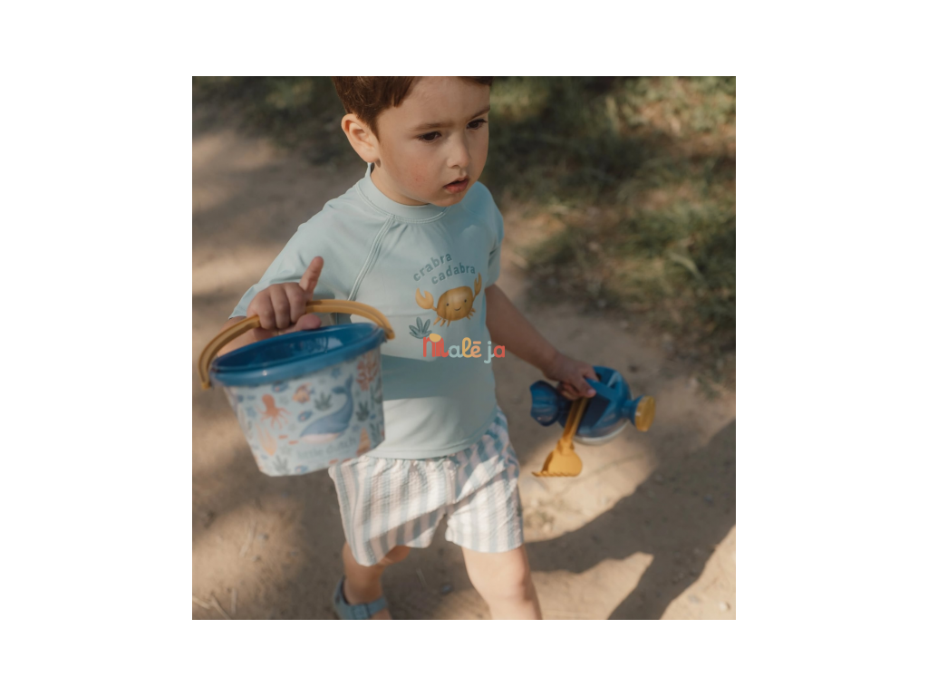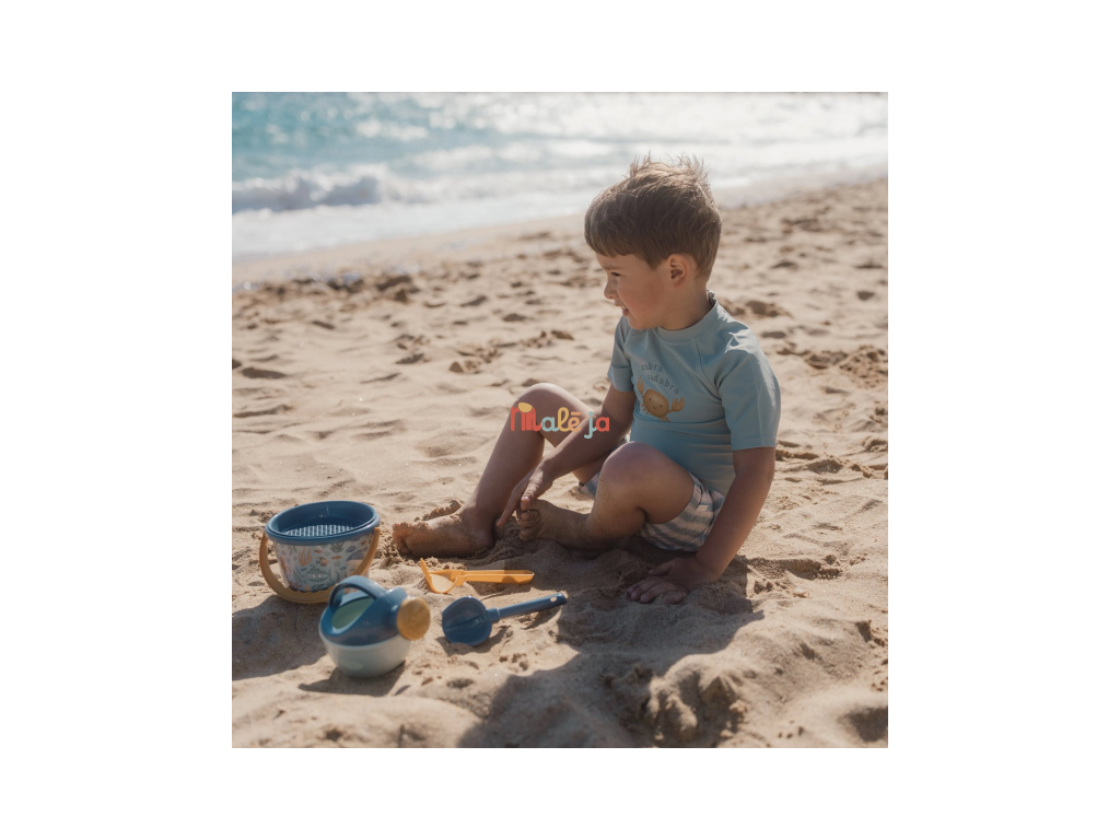 Súprava na piesok s krásnou potlačou motívov zo života pod morskou hladinou sa bude deťom hodiť doma na záhrade aj pri mori na pláži. Sadu tvorí vedierko, konvička, hrabličky, lopatka a sitko v kvalitnom prevedení z pevného plastu.