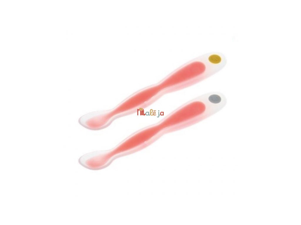 Lyžičky s tepelným senzorom Bebeconfort zmenia farbu, pokiaľ je teplota príkrmu príliš vysoká. Ideálne pre pokrmy ohrievané v mikrovlnnej rúre, pri ktorých hrozí riziko nerovnomerného ohriatia. Mäkké zakončenie je šetrné k citlivým ďasnám dieťaťa, dlhá rukoväť uľahčuje naberanie z pohára. Tvar lyžičky umožňuje položiť lyžičku na stôl bez toho, aby sa jej špička dotýkala stola. Vhodné pre deti od 4 mesiacov.