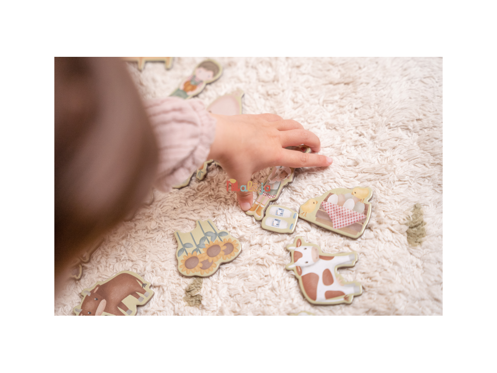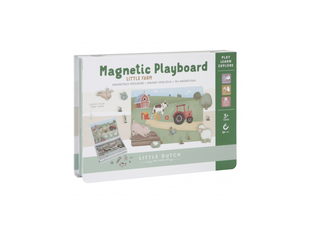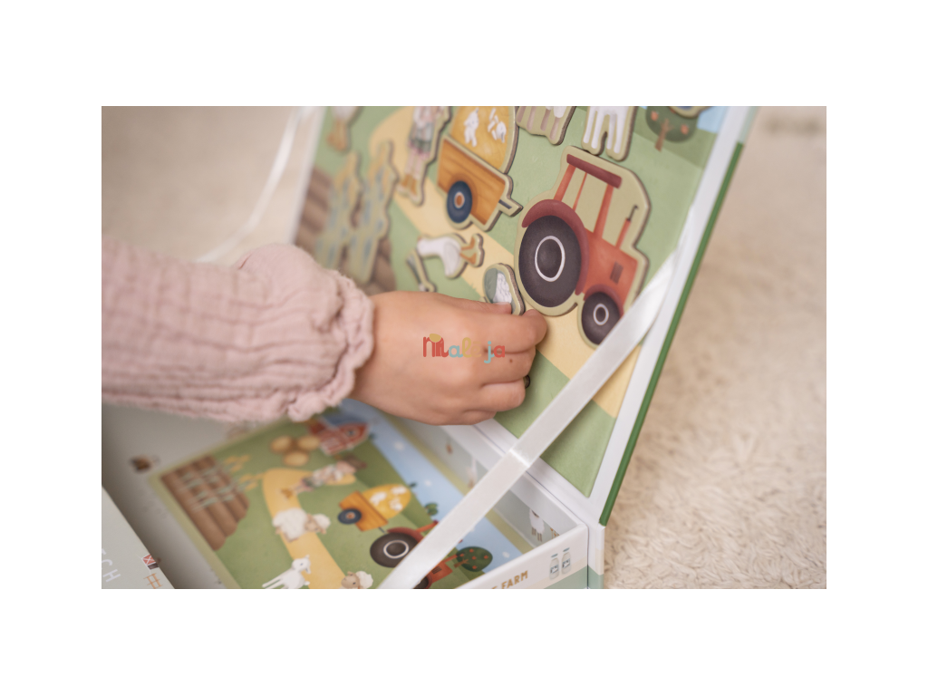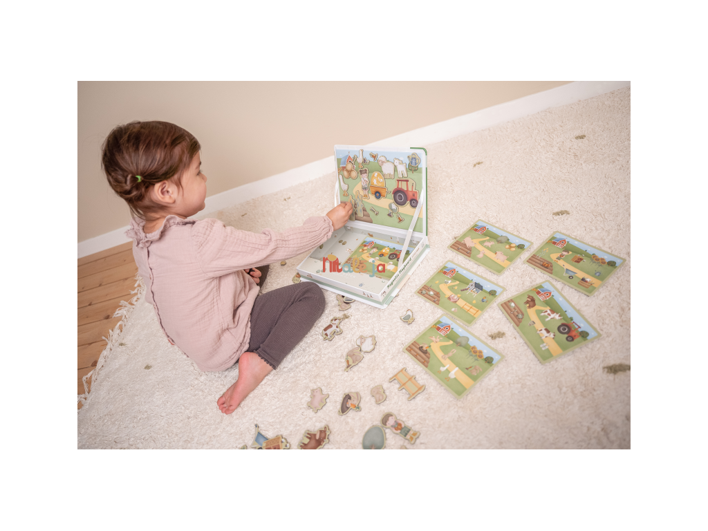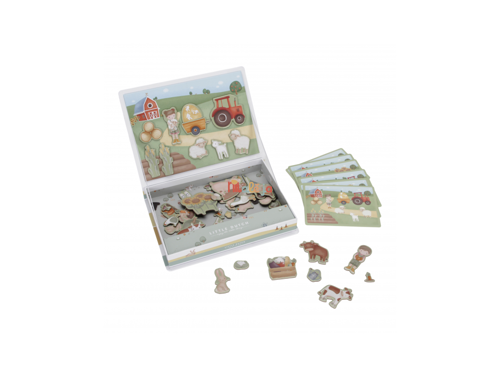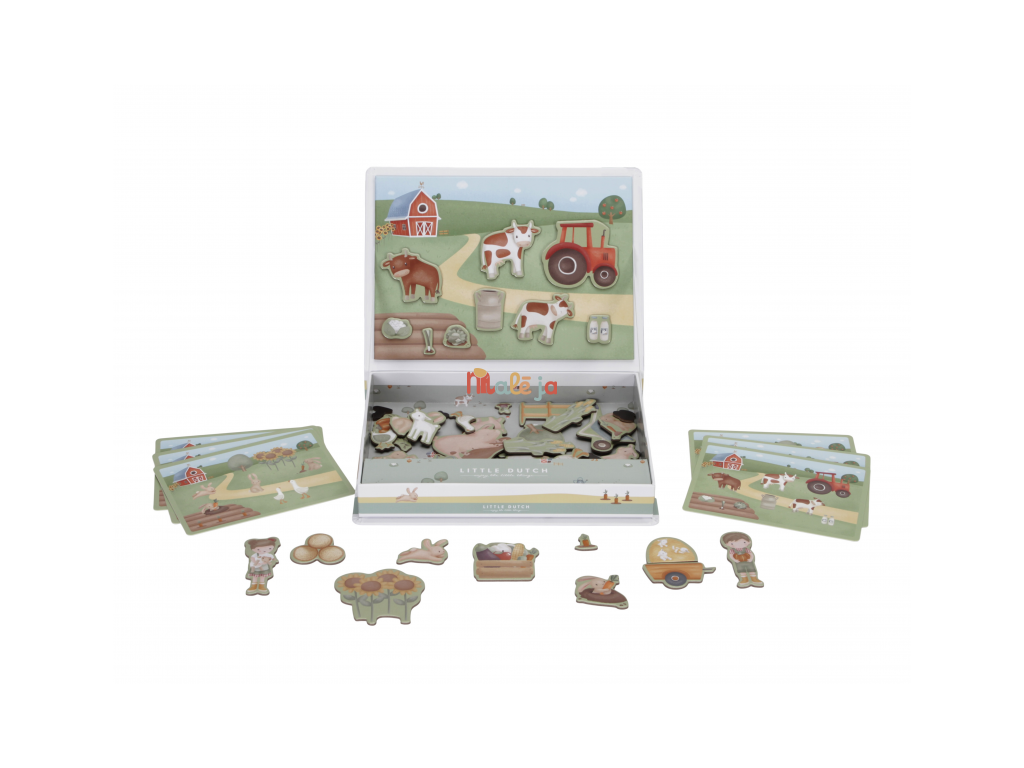 Magnetická hra sa skladá z magnetických dielov s motívmi zo života na farme a 6 vzorových kariet. Magnetické veko je možné použiť ako hernú dosku.