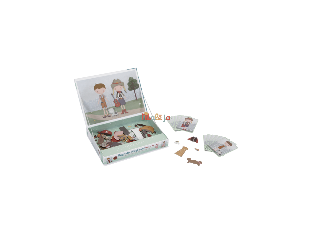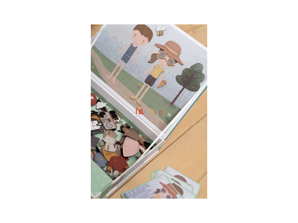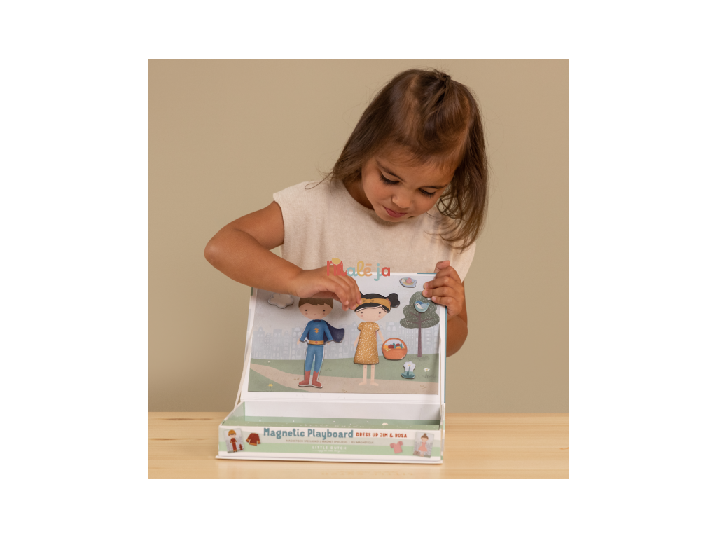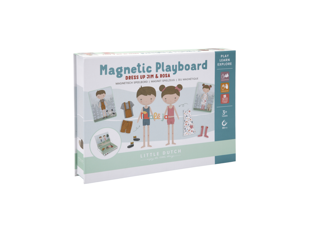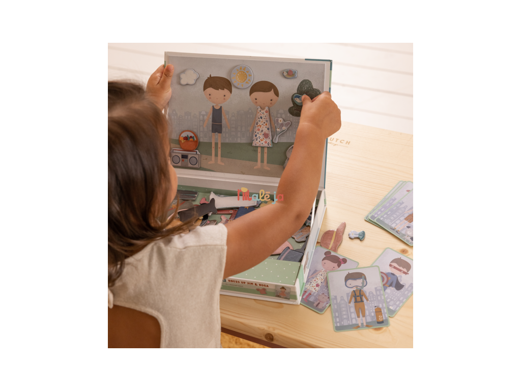 Oblečte sa s Jimom a Rosou! S touto magnetickou hrou môžete napodobniť oblečenie, ktoré je na karte pomocou magnetických dielikov na doske. Alebo použite vlastnú predstavivosť. Existuje nekonečné množstvo kombinácií, ktoré zaručujú zábavu a podporujú slovnú zásobu a koordináciu. Táto skvelá hra zabaví deti doma, ale aj na cestách.