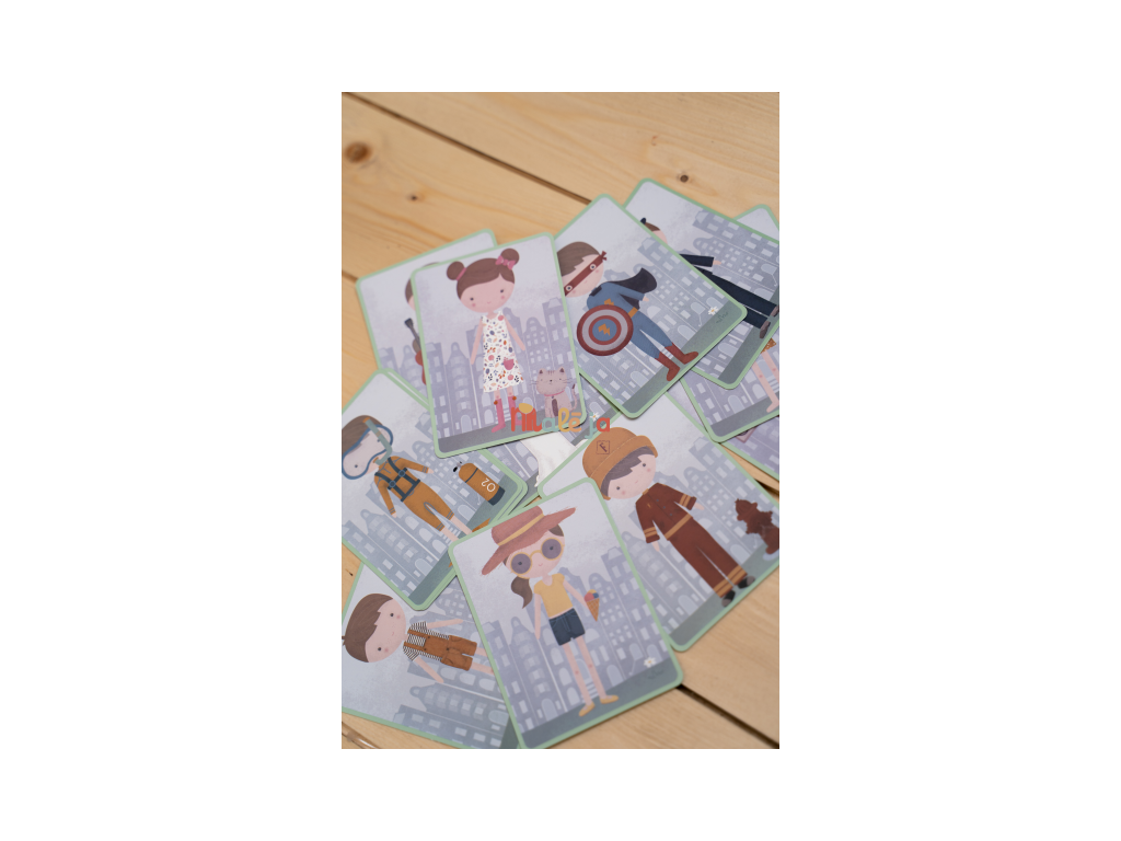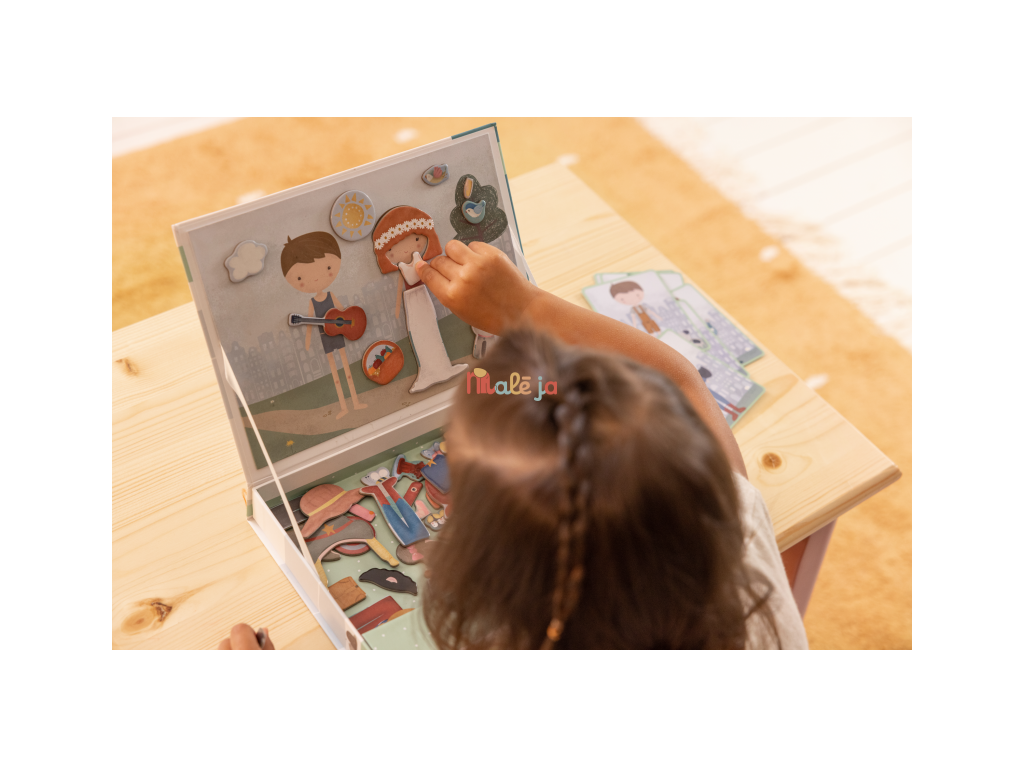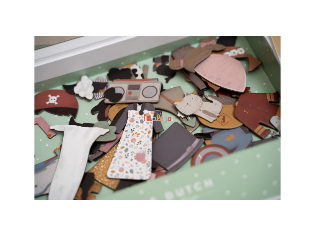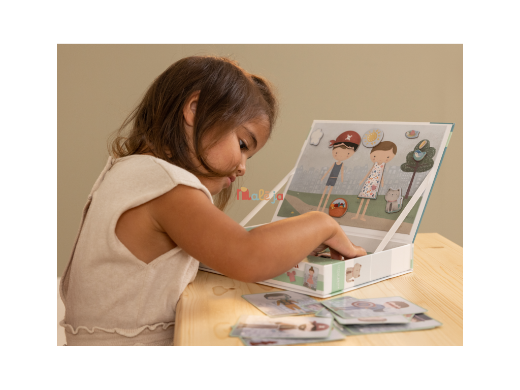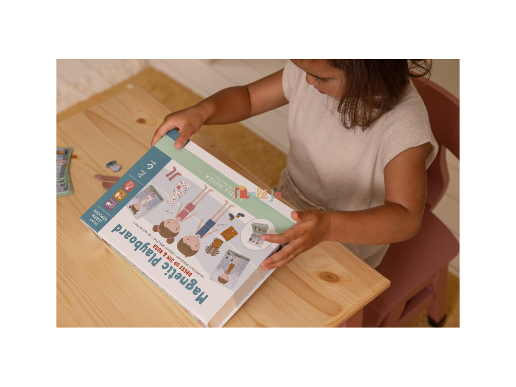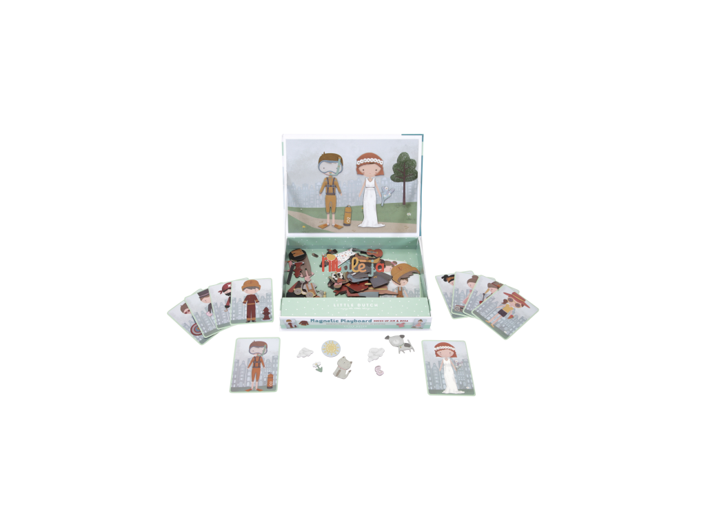 Oblečte sa s Jimom a Rosou! S touto magnetickou hrou môžete napodobniť oblečenie, ktoré je na karte pomocou magnetických dielikov na doske. Alebo použite vlastnú predstavivosť. Existuje nekonečné množstvo kombinácií, ktoré zaručujú zábavu a podporujú slovnú zásobu a koordináciu. Táto skvelá hra zabaví deti doma, ale aj na cestách.
