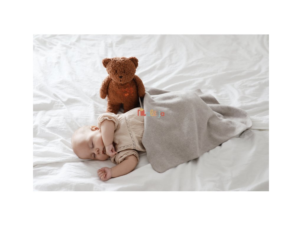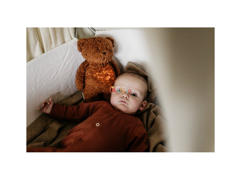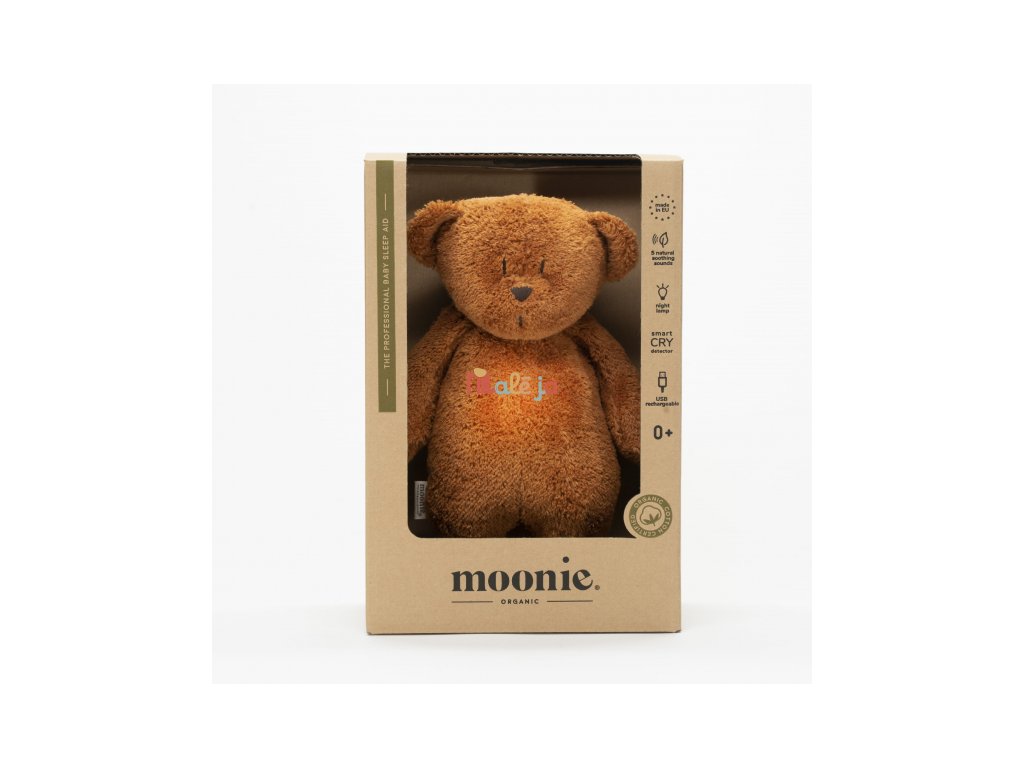 Moonie uspávačik v podobe rozkošného medvedíka s nočným svetlom a relaxačnými zvukmi pomáha bábätku upokojiť sa a ľahšie zaspať. Upokojujúce zvuky pripomínajú dieťaťu prostredie v maternici mamičky pred jeho narodením. Uspávačik ponúka päť prírodných relaxačných zvukov (tlkot srdca, vietor, lesný potok, morské vlny, dážď), kalimba uspávanku, dve klasické uspávanky a umožňuje nahranie vlastného hlasu. Bruško medvedíka svieti a slúži ako nočné svetlo s výberom siedmich farieb svietenia. Jemné svetlo pomáha dieťaťu cítiť sa v postieľke bezpečne. Svetlo je možné zapnúť aj bez zvukov. Pri zapnutej funkcii Shake svetlo zapnete zatrasením hračkou. Medvedík sa pri svietení nijako nezahrieva a je pre dieťa úplne bezpečný. Funkcia časovača umožňuje nastaviť dobu prehrávania na 30, 60 alebo 90 minút, než modul prejde do režimu inteligentného senzora plaču. Inteligentný senzor aktivuje zvuk a svetlo, keď dieťa začne plakať. Hračka potom prehráva relaxačné zvuky a jemne svieti po dobu 20 minút. Hudobný modul umožňuje nastavenie hlasitosti a doby prehrávania podľa vašich preferencií. Hračka sa dobíja s pomocou USB kábla, na plné nabitie potrebuje 3 hodiny. Plne nabitá batéria vydrží až 8 hodín nepretržitej prevádzky so zapnutým svetlom a zvukom.USB kábel je súčasťou balenia. Po vybratí zvukového a svietiaceho modulu môžete hračku prať v ruke. Medvedík je súčasťou produktovej rady Moonie Organic, vyrábanej z cetifikovanej organickej bavlny, farbenej netoxickými farbami. Bavlna pochádza z produkcie bez použitia pesticídov a toxických hnojív. Pri pestovaní organickej bavlny sa používa o 50% menej vody v porovnaní s priemyselným pestovaním.Výplň hračky tvorí recyklovaný materiál. Hračka bola testovaná švajčiarskym laboratóriom SGS a je v súlade so smernicou 2009/48/ES o bezpečnosti hračiek. Rozmery: 28 x 16 x 10,5 cm Vhodné pre deti od narodenia.