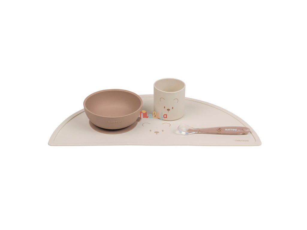 - Jedálenská súprava pre bábätká a malé deti: tanier, miska, pohár a lyžička z mäkkého silikónu.