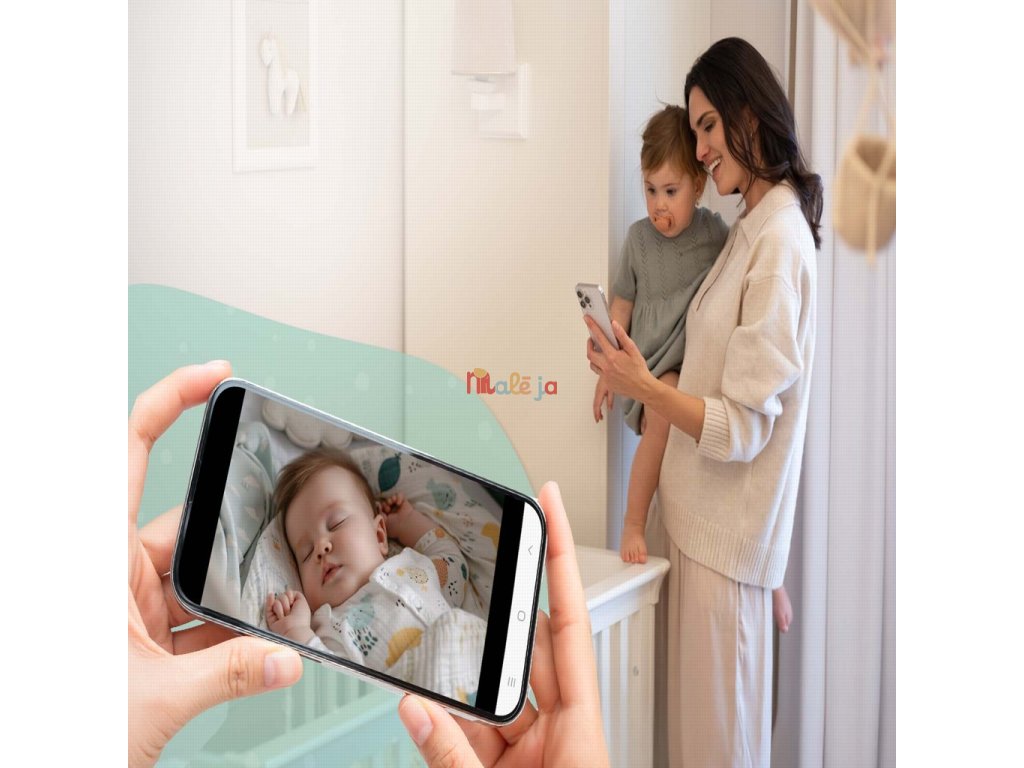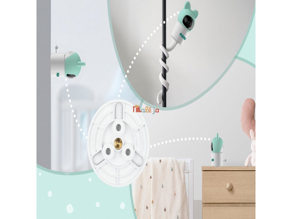 Monitorovaciu jednotku a napájacie káble nikdy neumiestňujte do detskej postieľky ani do dosahu dieťaťa – odporúčaná minimálna vzdialenosť je 1 meter. Ak zariadenie montujete na postieľku, vždy zabezpečte, aby bolo mimo dosahu dieťaťa. Všetky káble by mali byť umiestnené tak, aby ich dieťa nemohlo uchopiť ani vytiahnuť. Zariadenie sa nesmie používať v blízkosti vody ani pri zdrojoch tepla. Používajte výhradne napájacie adaptéry, ktoré sú súčasťou balenia. Do elektrickej zásuvky nevkladajte žiadne ostré ani kovové predmety.