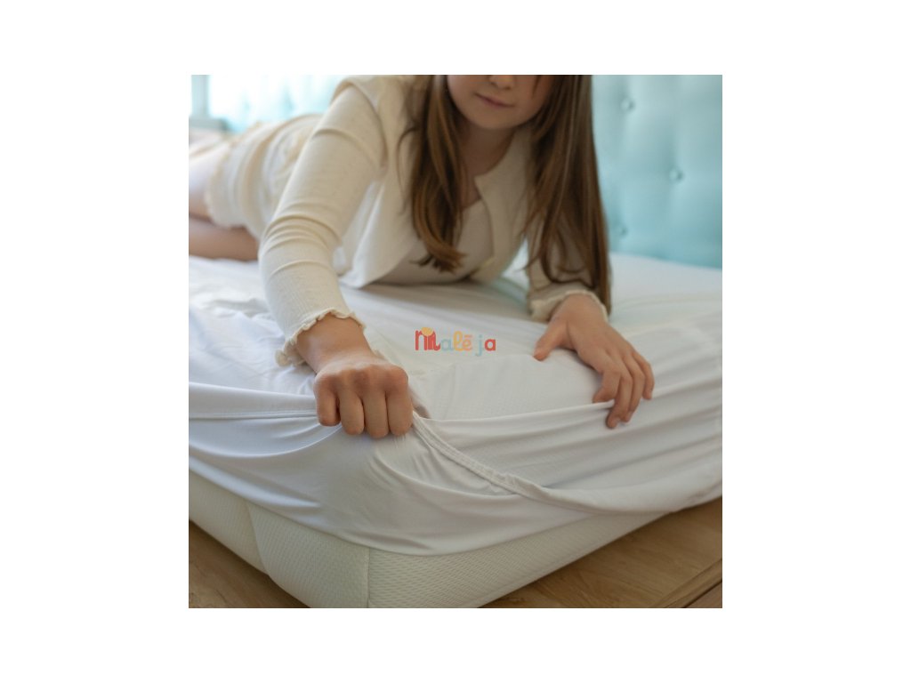 Prostěradlo je vyrobeno z přírodního vlákna Tencel, které je mimořádně jemné, šetrné k pokožce a dokáže regulovat tělesnou teplotu. Díky schopnosti rychle absorbovat a uvolňovat vlhkost pomáhá udržovat dítě v suchu a předchází pocení či podráždění pokožky. Vrchní vrstva prostěradla je opatřena tenkou, elastickou polyuretanovou membránou (PU), která zajišťuje spolehlivou voděodolnost a chrání matraci před prosakováním, skvrnami, prachem i roztoči. Napínací guma po obvodu umožňuje snadné natažení na matraci.