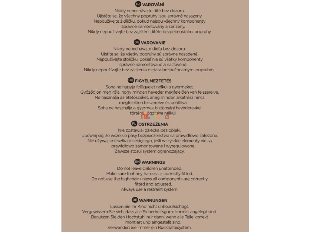 UPOZORNENIE Nikdy nenechávajte dieťa bez dozoru. Uistite sa, že všetky popruhy sú správne nasadené. Nepoužívajte stoličku, pokiaľ nie sú všetky komponenty správne namontované a nastavené. Nikdy nepoužívajte bez zaistenia dieťaťa bezpečnostnými popruhmi.
