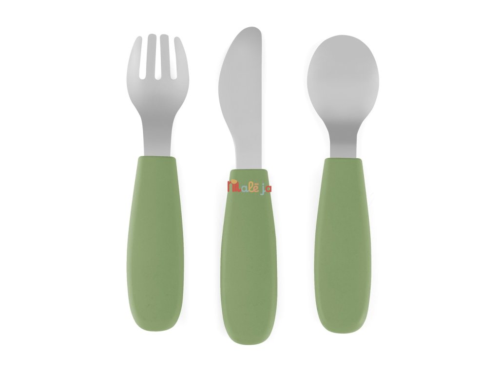 Funkčné časti sú vyrobené z kvalitnej nehrdzavejúcej ocele, rukoväte sú ergonomické a potiahnuté mäkkým silikónom vhodným na kontakt s potravinami – ideálne prispôsobené detským rúčkam. To zaručuje pohodlný a istý úchop a podporuje správne stravovacie návyky.