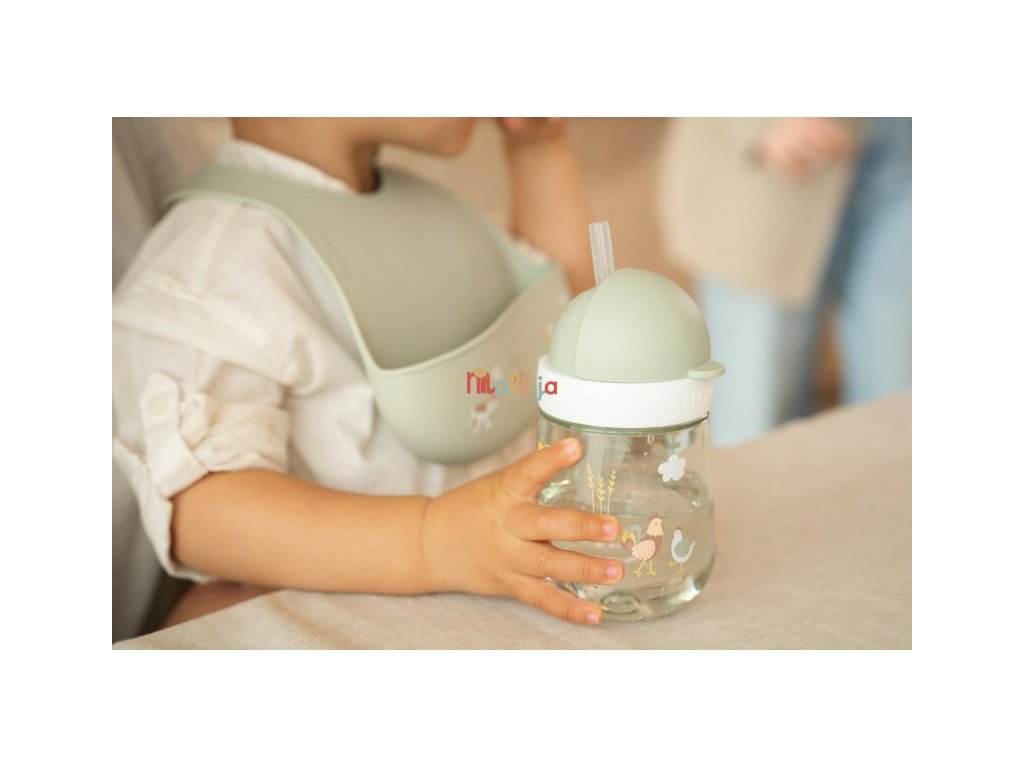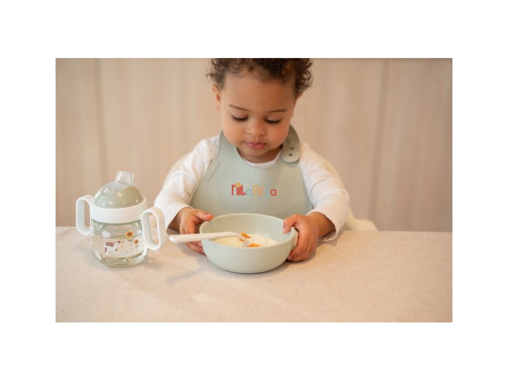 Podbradník z jemného, pružného silikónu s krásnou potlačou je vybavený širokým vreckom na zachytenie omrviniek i kvapiek. Dokonale ochráni oblečenie dieťaťa už od prvých pokusov o samostatné stolovanie. Zapínanie za krkom umožňuje ľahko upraviť veľkosť okolo krku.