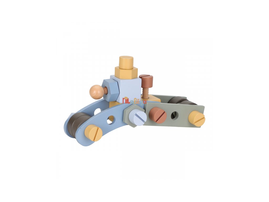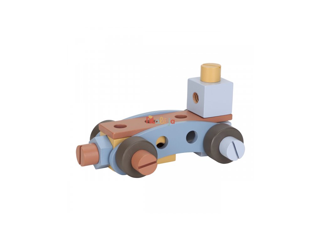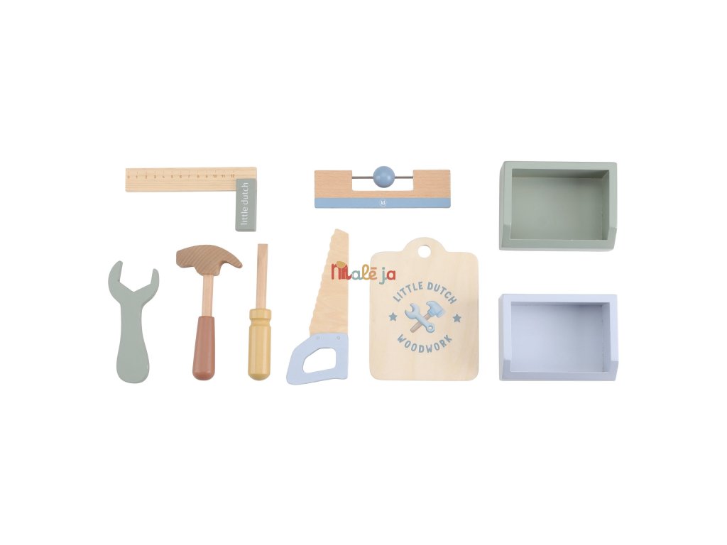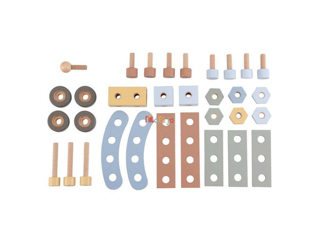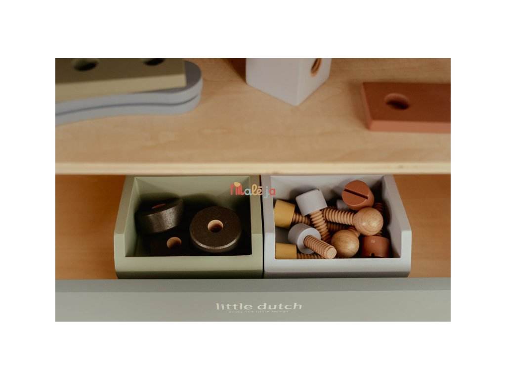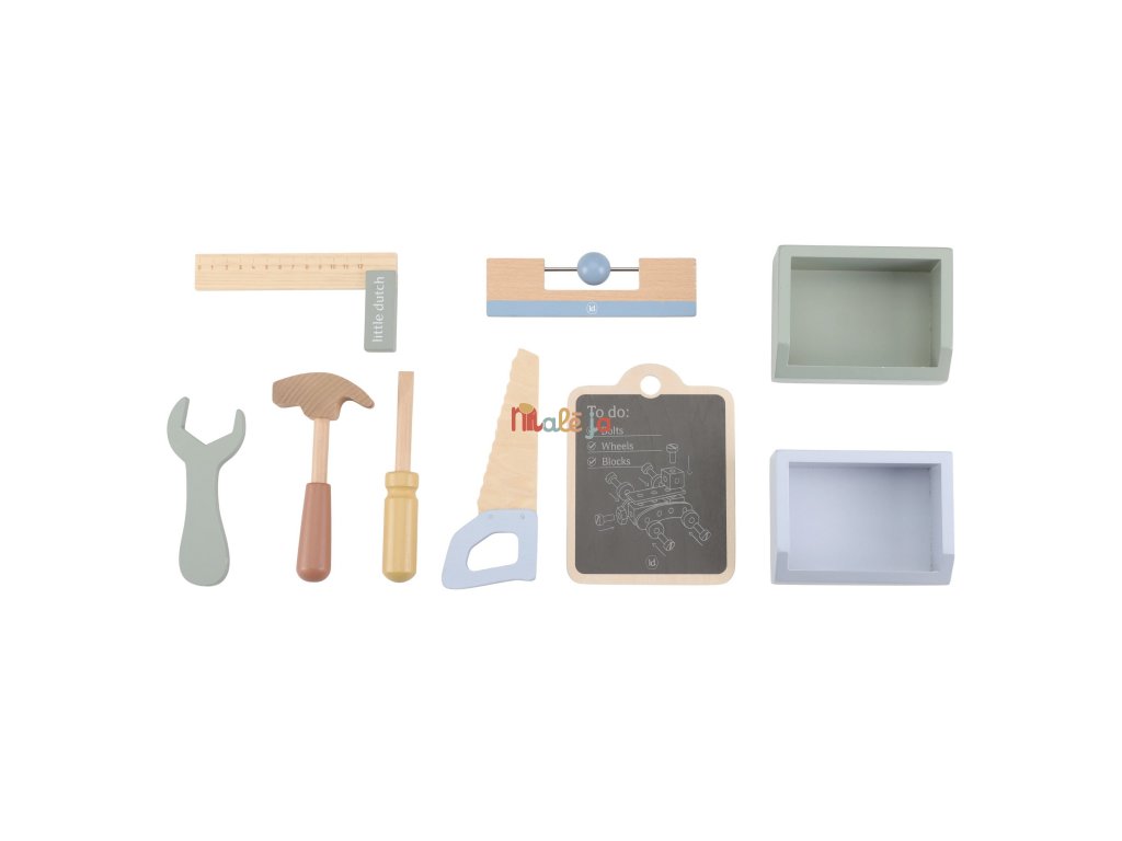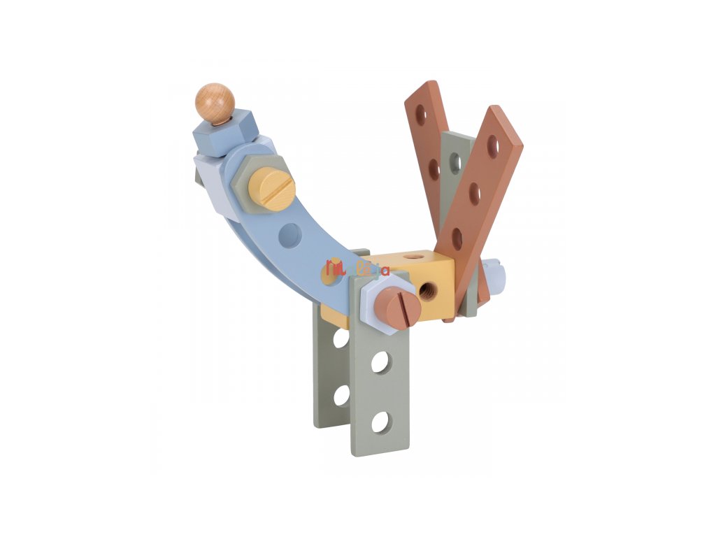 Detský ponk pre malých domácich majstrov v kvalitnom drevenom prevedení s náradím a ďalším príslušenstvom. Deti si môžu z jednotlivých dielov zostaviť napríklad autíčko alebo opraviť čokoľvek je potrebné. Súčasťou bohatého príslušenstva je detské kladivko, kľúč, skrutkovač, pílka, vodováha, meter, matice a skrutky. Malé deti milujú napodobňovanie svojich rodičov pri ich činnostiach a tento ponk s náradím im umožní zostaviť a skonštruovať rôzne veci, rovnako ako to vedia ich rodičia! Aktivitou pri skrutkovaní a zostavovaní častí dohromady a ich opätovnému rozpojovaniu sa učia jemnej motorike a sústredení, kreativite a predstavivosti. Skvelý spôsob, ako deťom ponúknuť kreatívny priestor na tvorenie a objavovanie. Rozmery: V 86 x Š 55 x H 30,5 cm Vyrobené z odolného FSC certifikovaného dreva. Vhodné pre deti od 3 rokov.