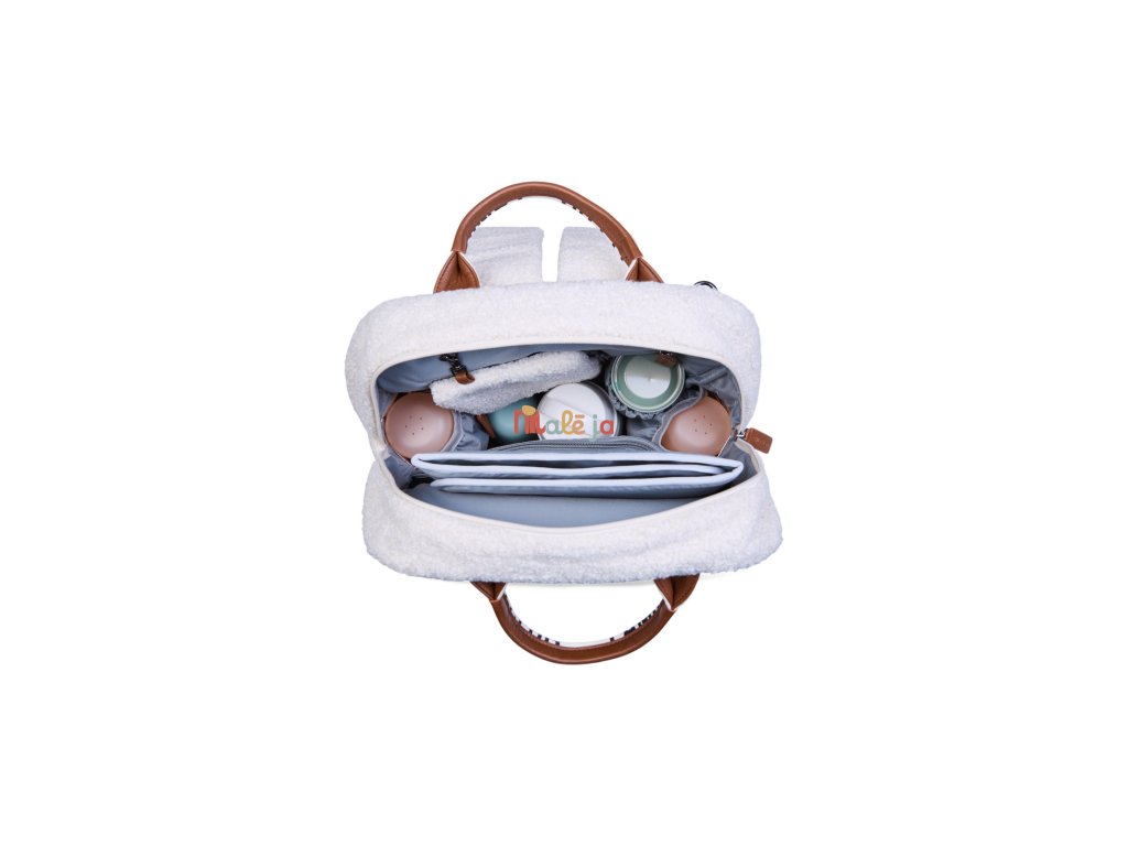 Součástí batohu je přebalovací podložka a termoizolační kapsy na láhev. Přehlednou organizaci obsahu batohu zaručuje množství vnitřních i vnějších kapes a úchytů. Díky speciální kapse pro vlhčené ubrousky jsou ubrousky vždy okamžitě po ruce připravené k použití. Úchyty na kočárek umožňují zavěšení batohu na rukojeť kočárku, úchyt na vytahovací rukojeť kufru vám usnadní cestování během dovolené.