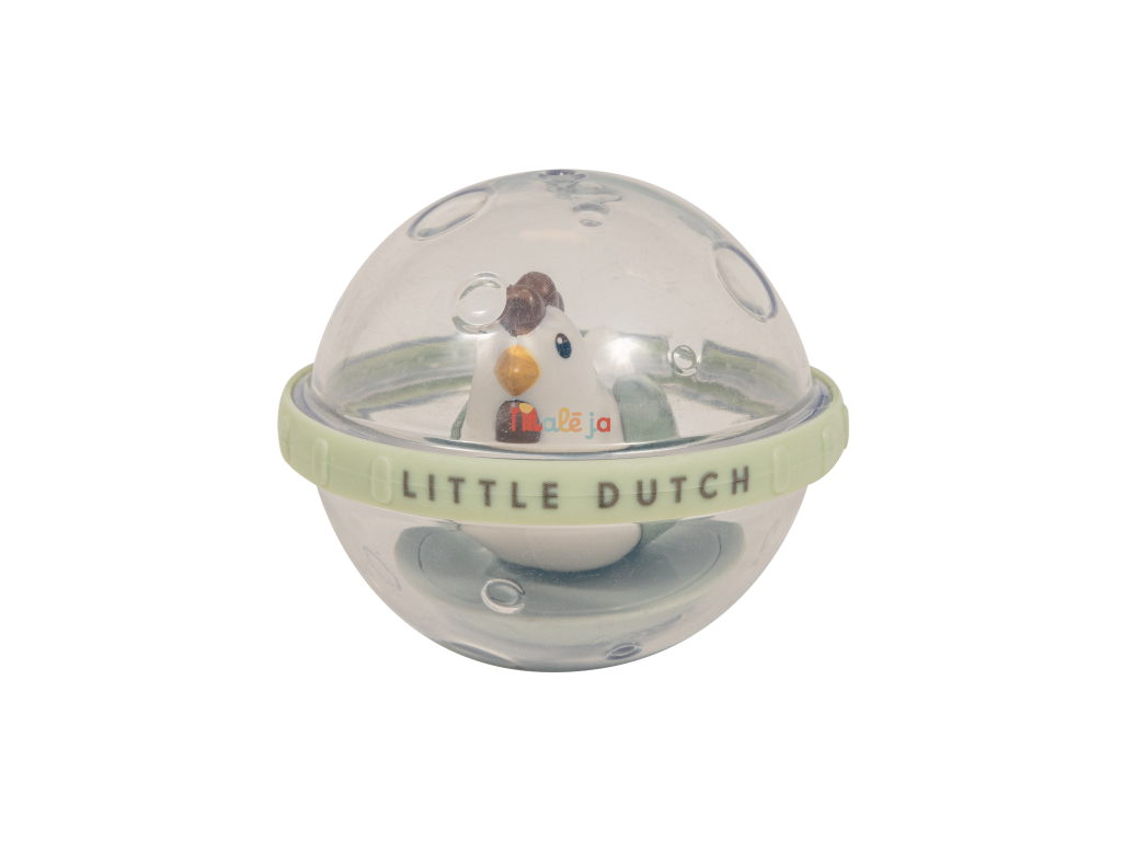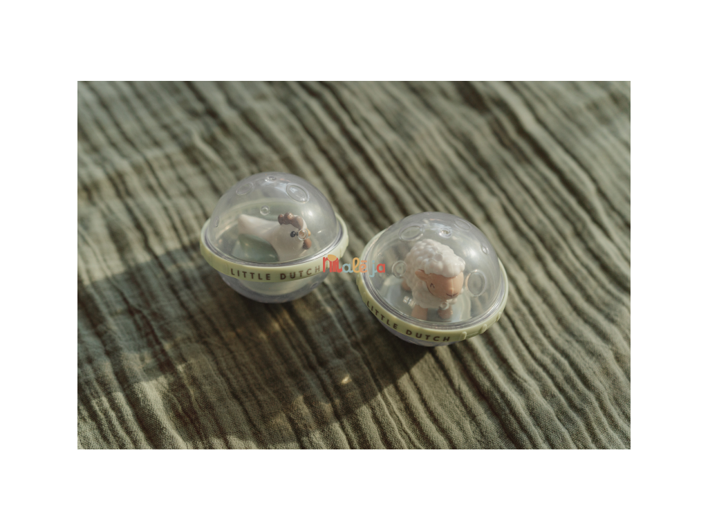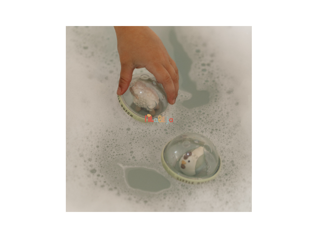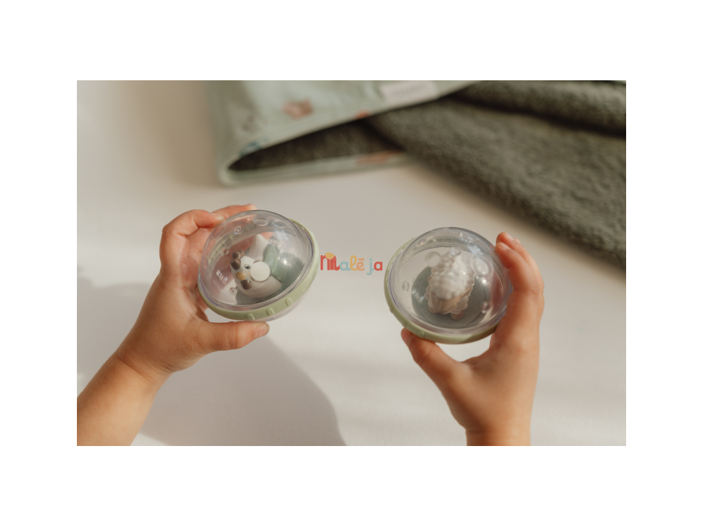 Dve priehľadné loptičky s pohyblivou hračkou vo vnútri v podobe ovečky a sliepočky sú skvelou hračkou do kúpeľa aj na hraciu deku.