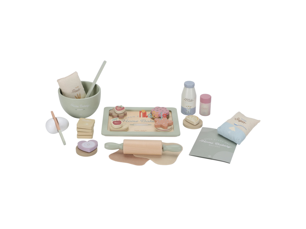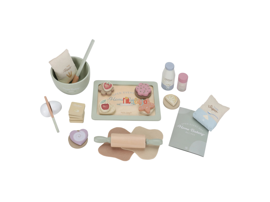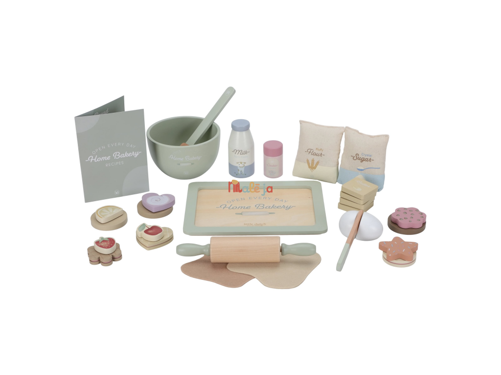Sada obsahuje všetko potrebné na pečenie: kartičku s receptom, drevené suroviny ako vajcia, maslo, múku, cukor, mlieko, farebné posypky ak tomu misu na miešanie, valček, tácku a doplnky na zdobenie. Nechýbajú ani hotové kúsky cukroviniek a plát cesta z plsti, ktorý si môžu deti rozváľať a nazdobiť podľa vlastnej fantázie.
