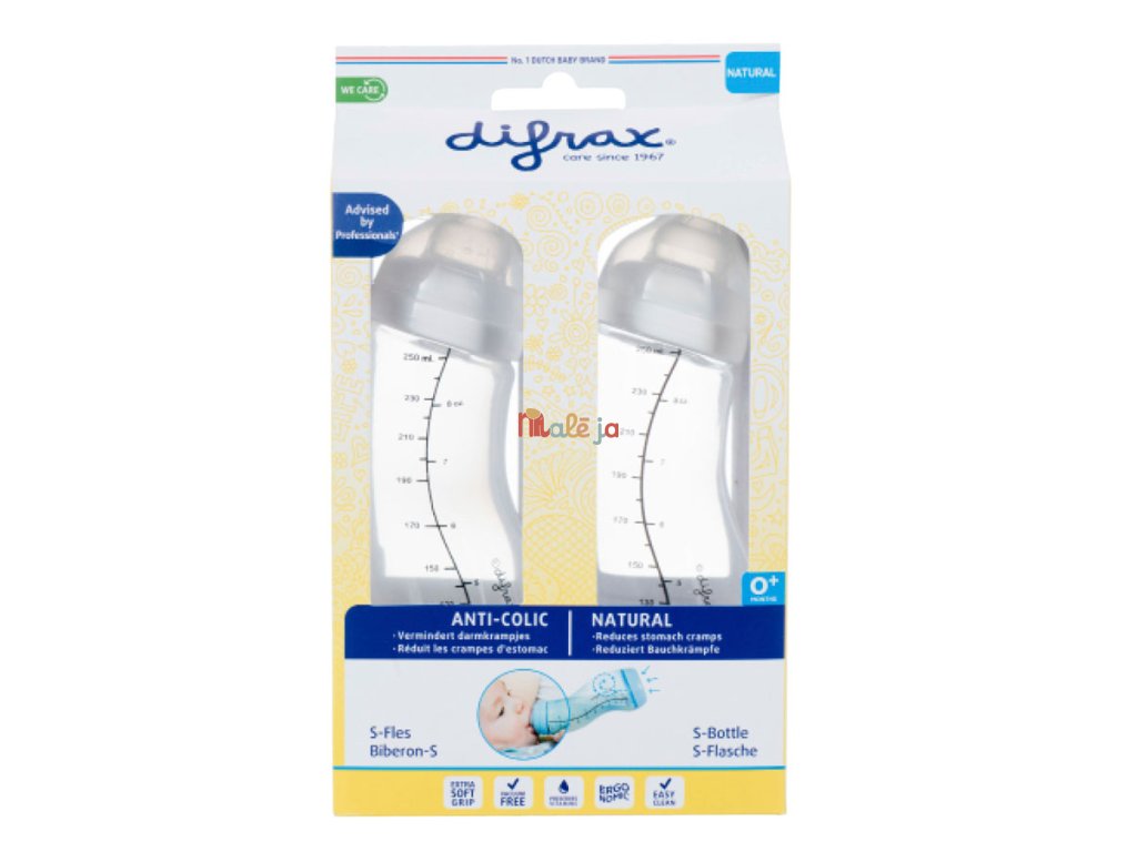 Ušetrite a zadovážte si zvýhodnený set dvoch dojčenských S-fľašiek Difrax 250 ml, ktoré sú už niekoľko rokov prvou voľbou bábätiek, mamičiek aj oteckov. Esíčkovitý tvar a antikolikový ventil na dne fľašky spoločne zaručujú bábätku bezpečný príjem potravy bez primiešaného vzduchu. Môžete ich používať hneď od narodenia a osvedčujú sa aj v kombinácii s dojčením. Neskôr sú tiež vhodné pri podávaní kašičiek a hustejšej stravy. Zamedzíte tak žalúdočným kŕčom aj dáveniu. S-fľaška Difrax je prvou svojho druhu, ktorá bábätku aj rodičom zaisťuje kŕmenie v prirodzenej polohe, rovnako ako pri dojčení. V sete sú dve fľašky. Pred každým použitím skontrolujte, že sú prieduchy v antikolikovom ventile čisté a teda priechodné.