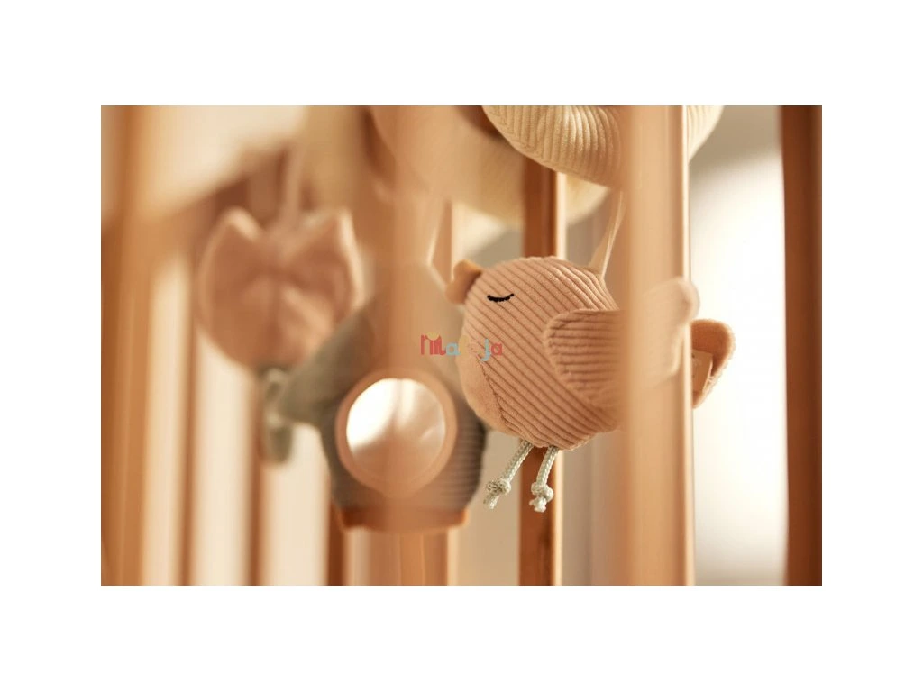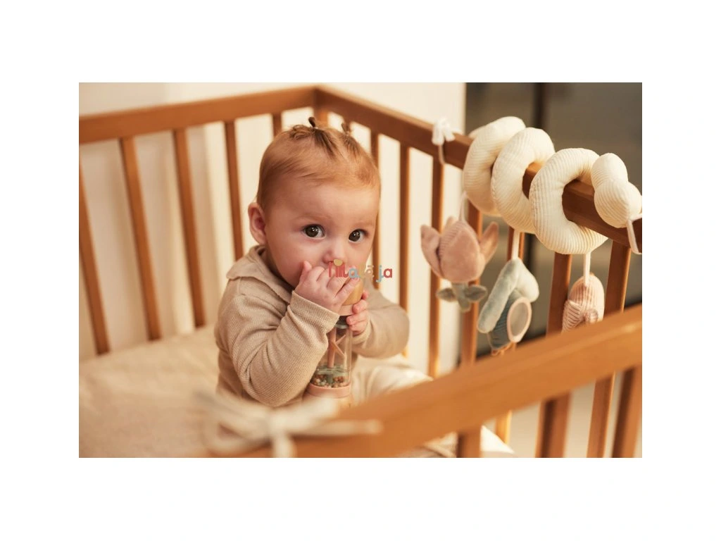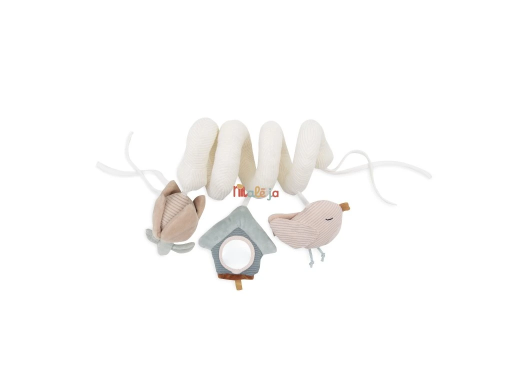Textilná špirála so zavesenými hračkami v podobe vtáčika, tulipánu a vtáčej búdky s bezpečným zrkadlom zabaví vaše bábätko v postieľke, kočíku aj v autosedačke. Mäkké hračky vyrobené z jemného plyšu hrkajú, šuštia a ponúkajú rôzne textúry na skúmanie. Hračky stimulujú koordináciu ruka/oko dieťaťa. Špirálu ľahko pripevníte omotaním okolo bočnice postieľky či madla autosedačky aj kočíka. Vhodné pre deti od narodenia.