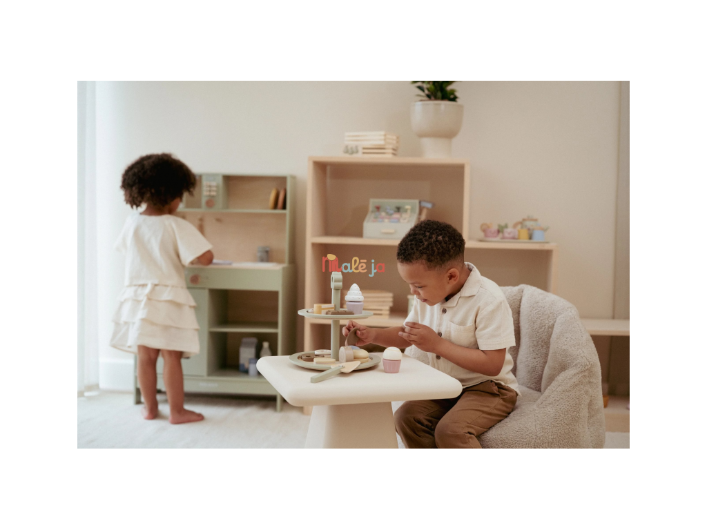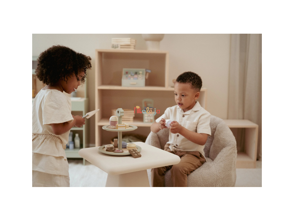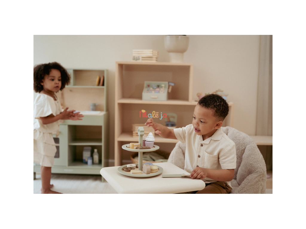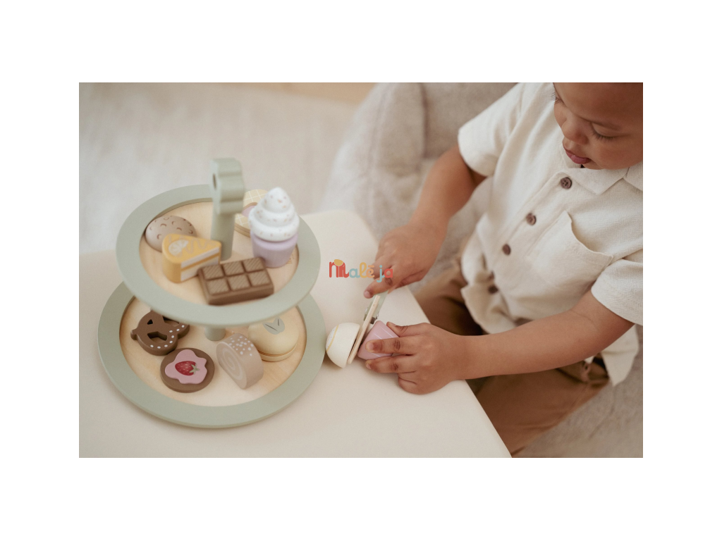 Elegantný stojan v kvalitnom drevenom prevedení je skvelým doplnkom pre hru na čajové večierky, narodeninové oslavy alebo vlastnú detskú cukráreň. Podporuje rozvoj fantázie, jemnej motoriky i sociálnych zručností – či už deti obsluhujú svojich plyšových kamarátov, rodinu alebo organizujú hostinu pre princeznú z rozprávkovej krajiny.