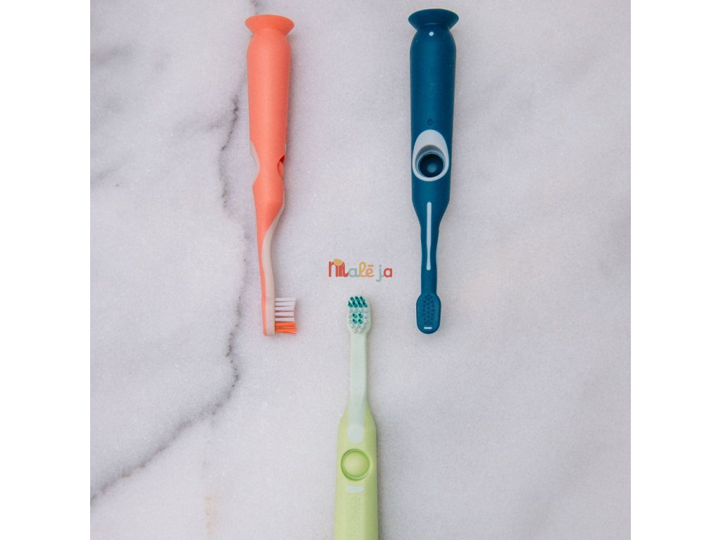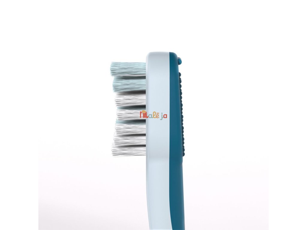 - Rukoväť s proti sklzovým povrchom a mäkkou časťou sa dobre drží aj malou detskou rukou - ideálnou na prvé samostatné čistenie zúbkov.