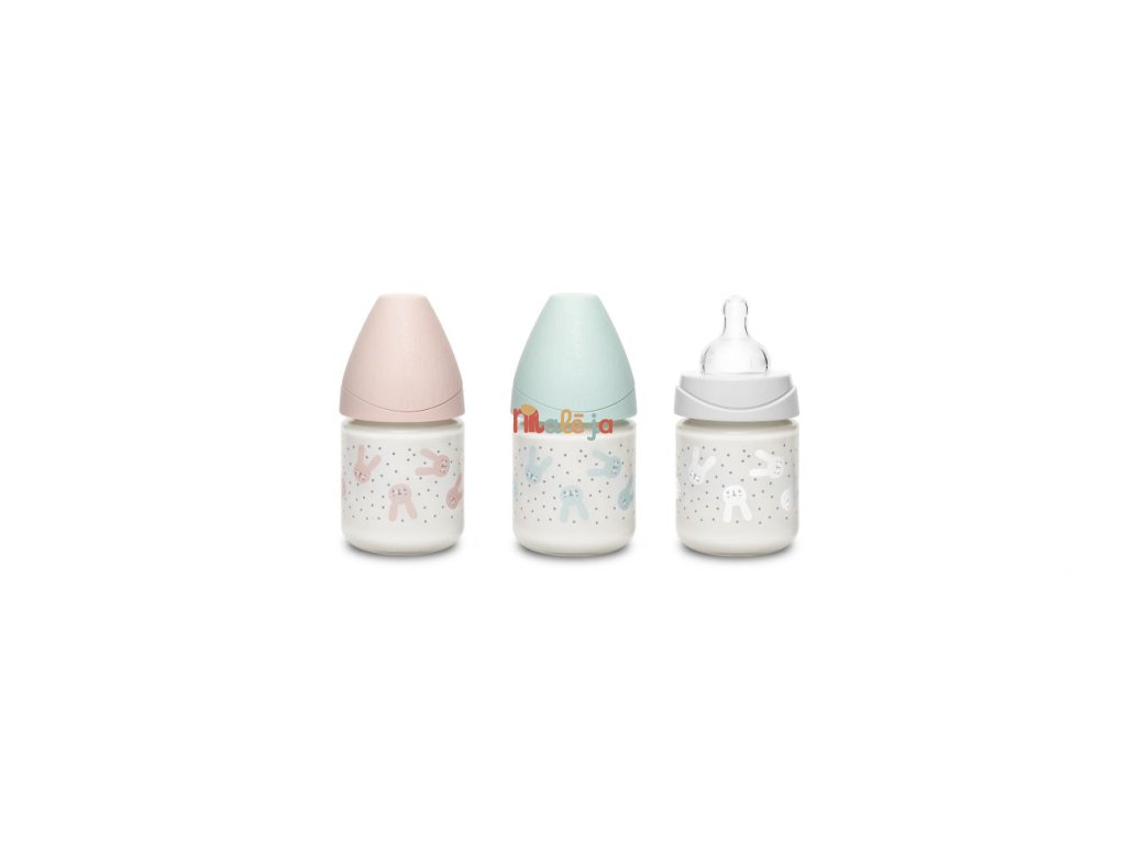 Sklenená dojčenská fľaša z kolekcie Hygge má fyziologický (guľatý) silikónový cumlík s veľkosťou prietoku S, čo je pomalý prietok. Vďaka ventilom umiestneným na hornej hrane cumlíka napomáha predchádzať čkaniu a kolikám.