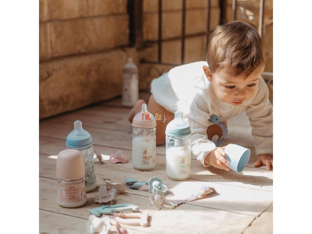 Sklenené fľaše z kolekcie Wonderland so savičkou SX Pro so stredným prietokom sú ideálnou voľbou pre každodenné kŕmenie bábätka.