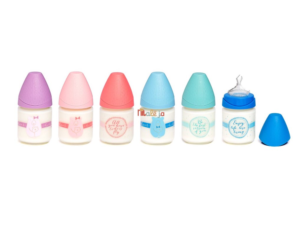 Sklenená dojčenská fľaša z kolekcie Meaningful Life má anatomický silikónový náhradný cumlík s veľkosťou prietoku S, čo je pomalý prietok. Vďaka ventilkům umiestneným na hornej hrane náhradného cumlíka napomáhajú predchádzať čkaniu a kolikám.