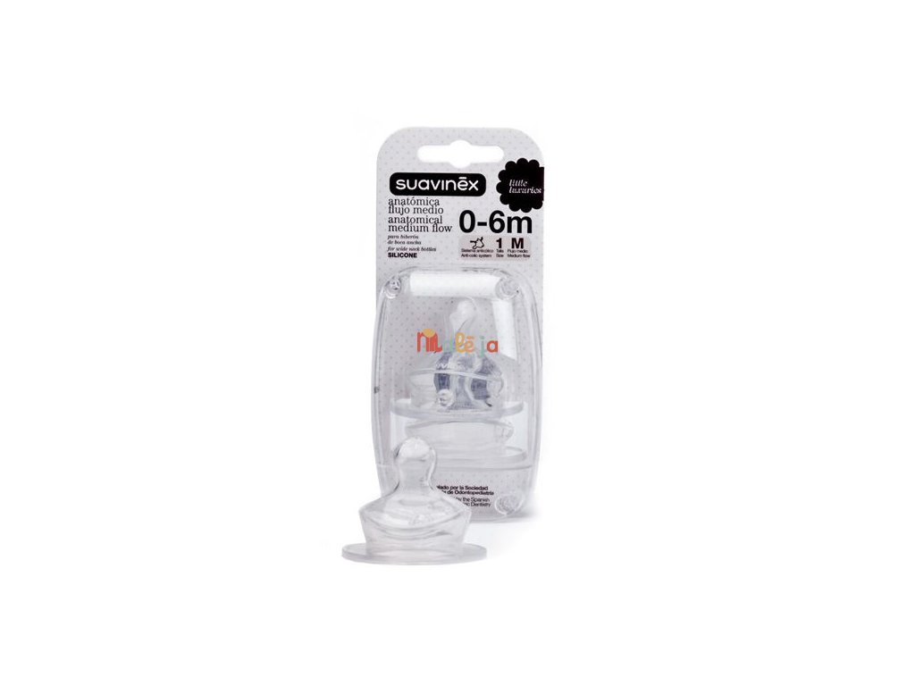 Pri výrobkoch Suavinex máte tiež možnosť voľby materiálu náhradných cumlíkov - latexové/silikónové a možnosť výberu veľkosti prietoku náhradného cumlíka - S, M a L (od najmenšieho po najväčšie).