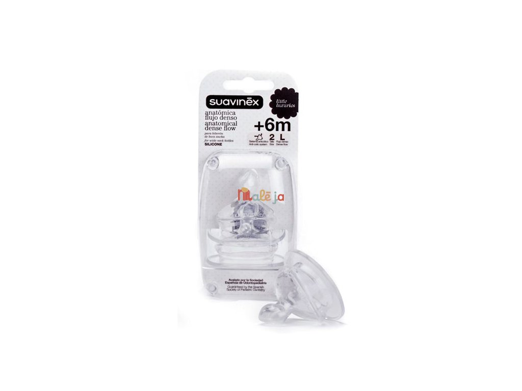 Pri výrobkoch Suavinex máte tiež možnosť voľby materiálu náhradných cumlíkov - latexové/silikónové a možnosť výberu veľkosti prietoku náhradného cumlíka - S, M a L (od najmenšieho po najväčšie).
