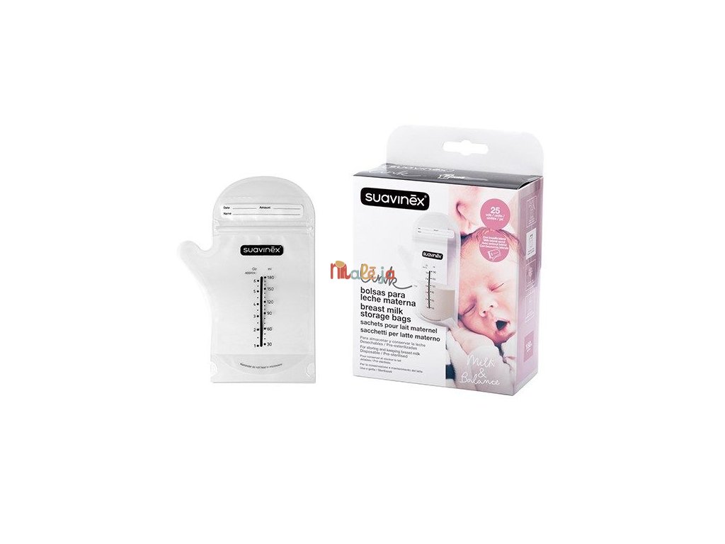 Jednorazové sáčky Suavinex s bočnou lievikom umožňujú jednoduché skladovanie materského mlieka po jeho odstriekavanie. Naplnené sáčky môžu byť uskladnené v chladničke či v mrazničke a vďaka svojmu širokému priemere získavajú dôležitú stabilitu. Svojou malou veľkosťou sú veľmi skladné a môžu byť naskladané jednotlivo na seba.