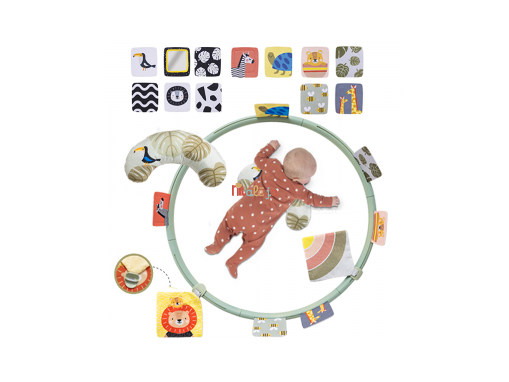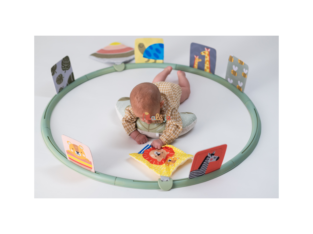Unikátny hrací kruh ponúka 16 rôznych aktivít podporujúcich hranie dieťaťa na brušku. Kruh sa skladá z niekoľkých dielov, ktoré rýchlo a jednoducho spojíte dohromady. Do otvorov v kruhu môžete pripevniť ľubovoľné kombinácie aktivít a pripraviť tak dieťaťu vždy nové prostredie na skúmanie a hranie. Vankúšik z mäkkého, príjemného materiálu je špeciálne navrhnutý, aby podporoval hranie dieťaťa na brušku. Poloha na brušku je dôležitá pre posilňovanie krčných a chrbtových svalov, ktoré neskôr umožňujú dieťaťu začať sa pretáčať, liezť a sedieť bez opory.